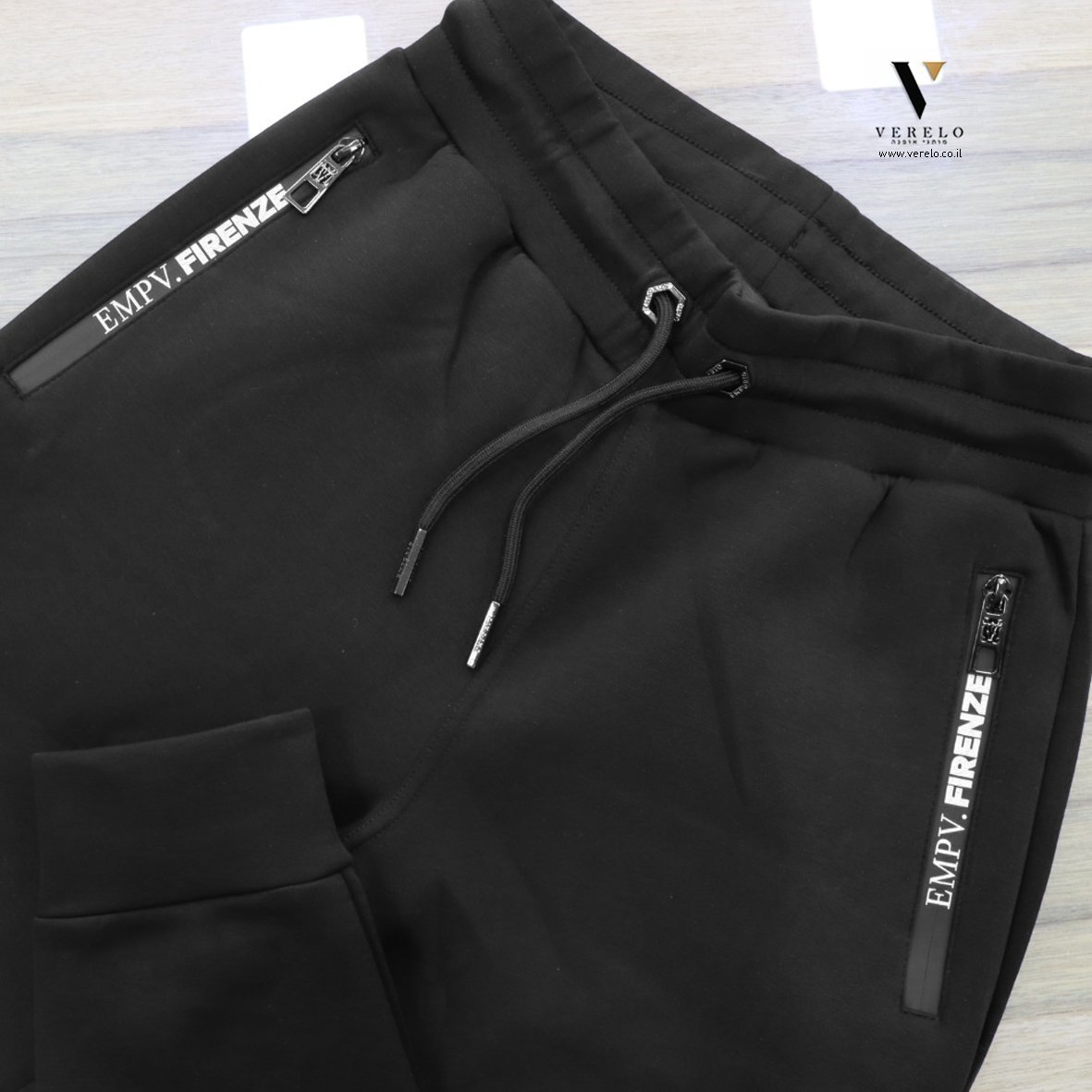•המכנסים צבע שחור שילוב עיצוב מודפס בתחתית המכנס ושם החברה על הרוכסן מודפס.