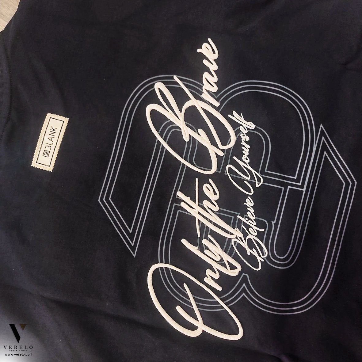 בגב החולצה עיצוב יפה גדול עם שילוב עיצוב טיפוגרפי ,שילוב הדפס ועבודת ריקמה .