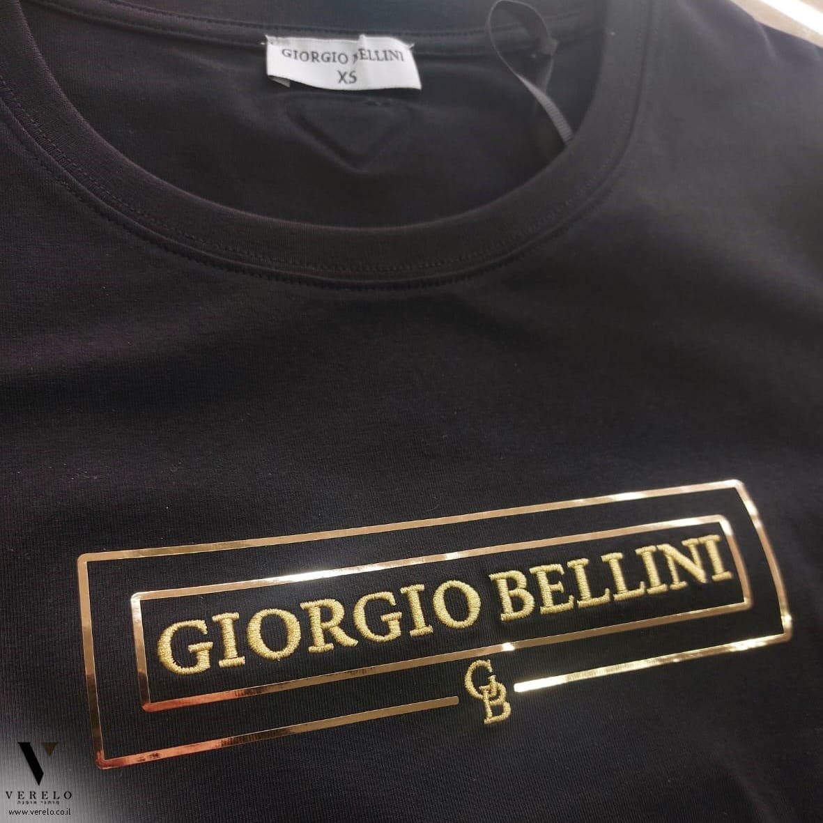 • גזרת סלים עם לוגו מובלט GIORGIO BELLINI בצבע זהב בחזית של החולצה. בגב החולצה תבליט שם BELLINI מוזהב בקטן בתוך בלטוה משולשת .