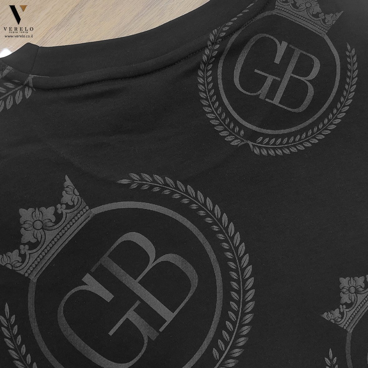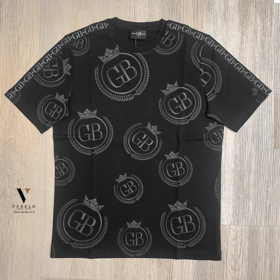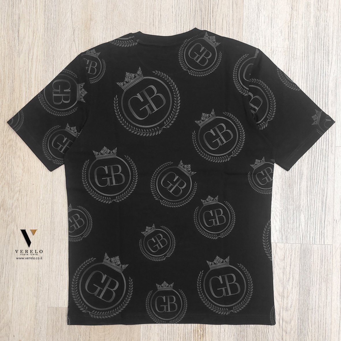 •לוגו החברה GB בתוך כתר עם עיצוב יפה ומפוזר על כל הטי-שירט מקדימה ובגב וגם על השרוולים והכל עבודת הדפס.