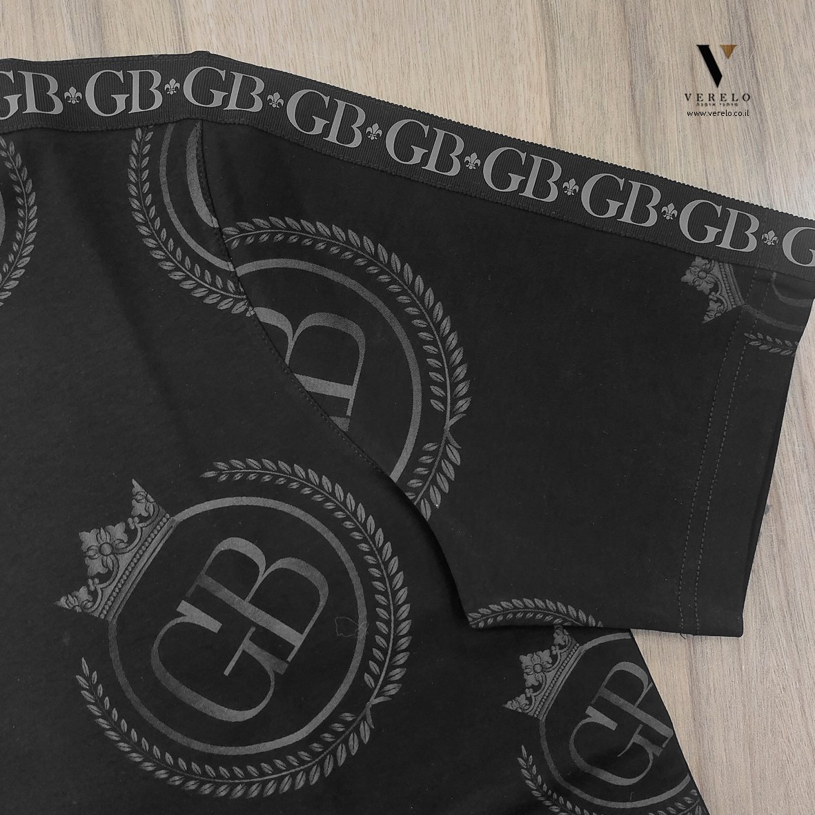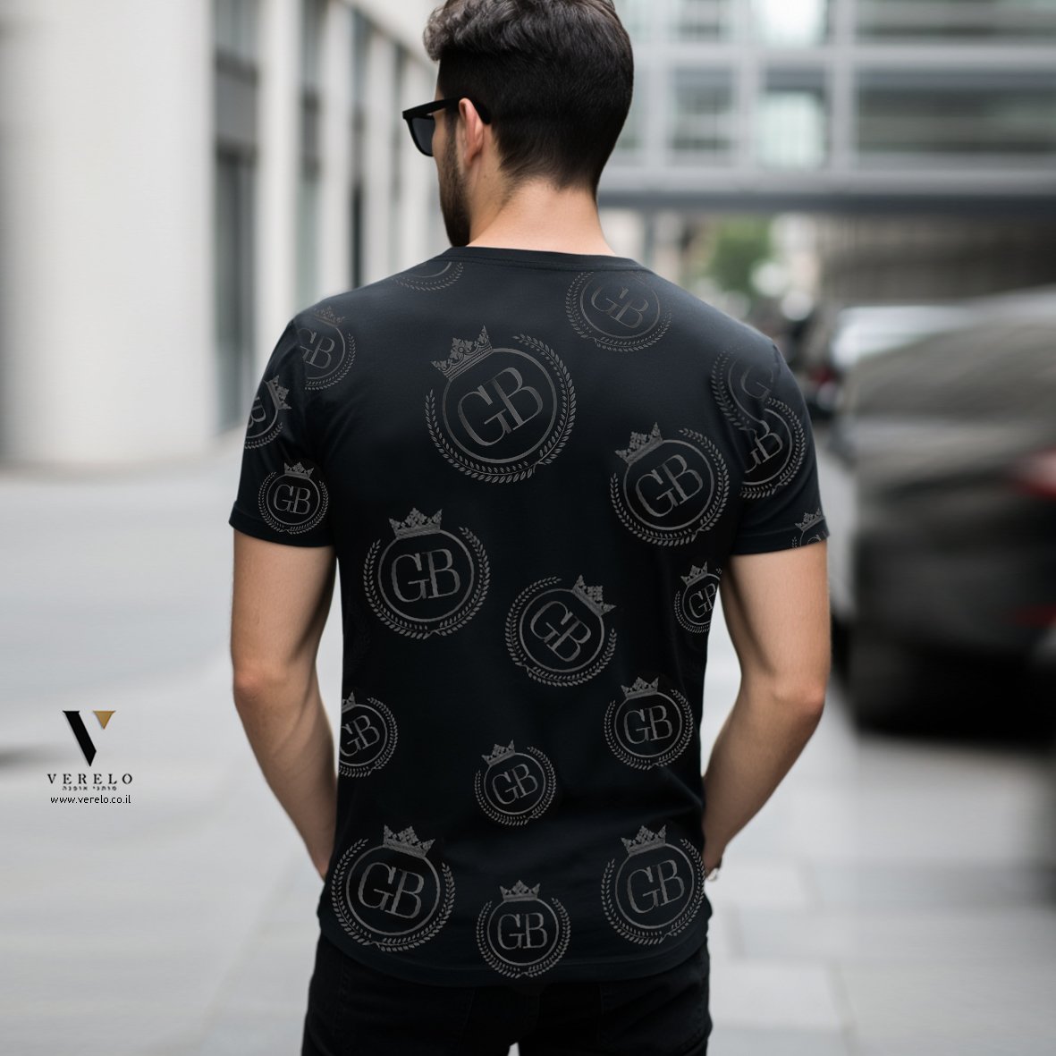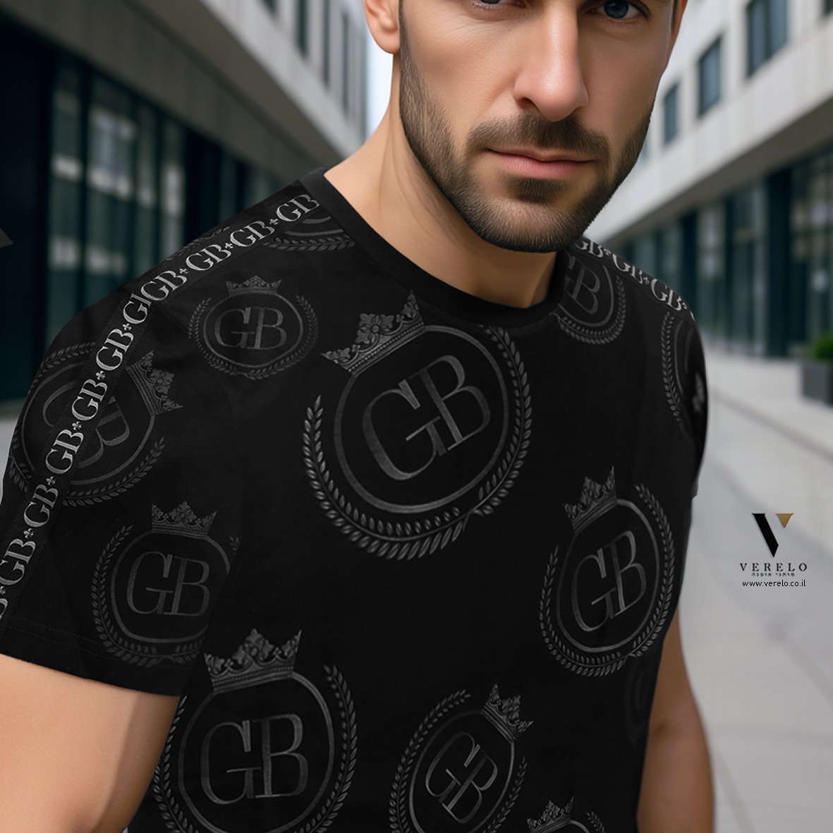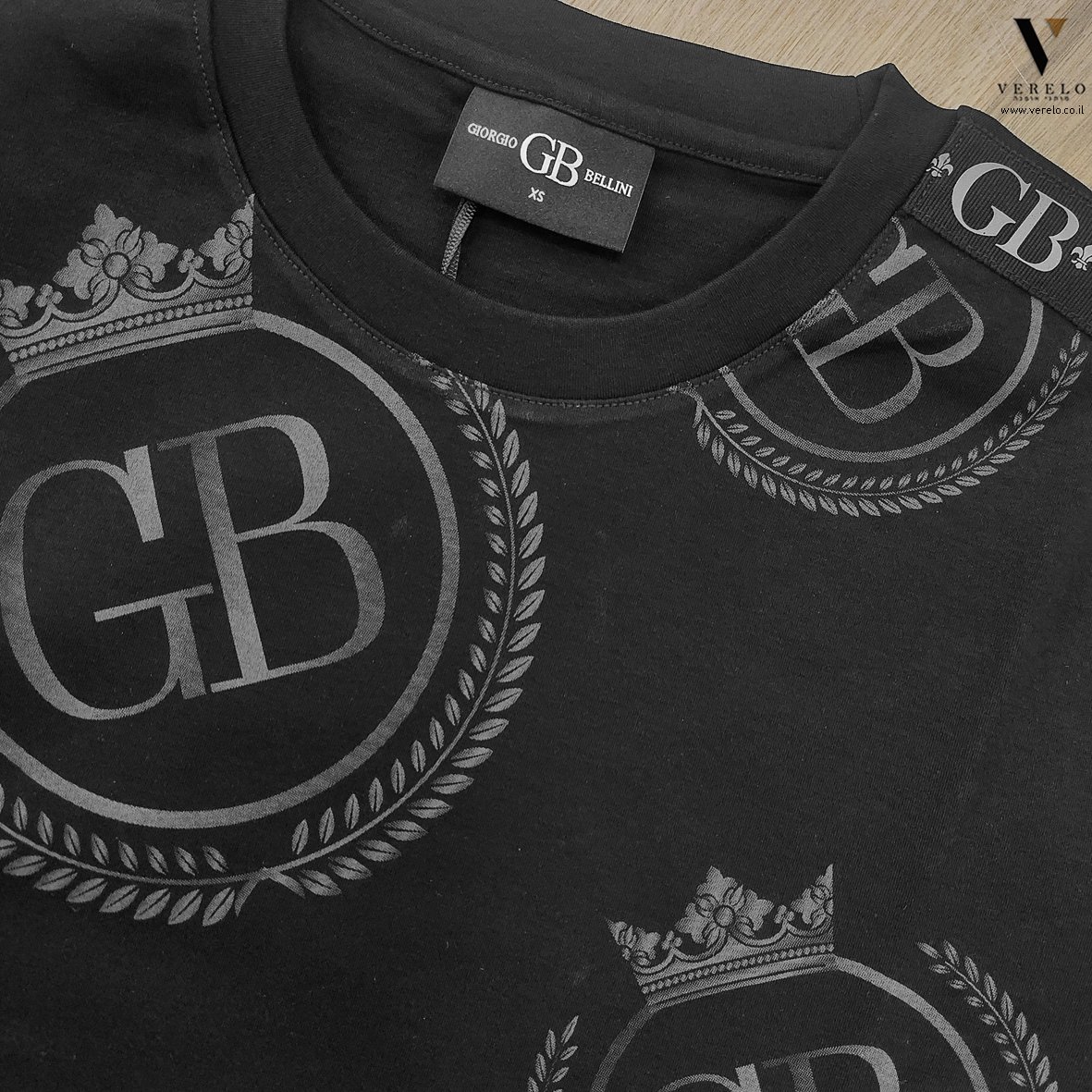 •לוגו החברה GB בתוך כתר עם עיצוב יפה ומפוזר על כל הטי-שירט מקדימה ובגב וגם על השרוולים והכל עבודת הדפס.