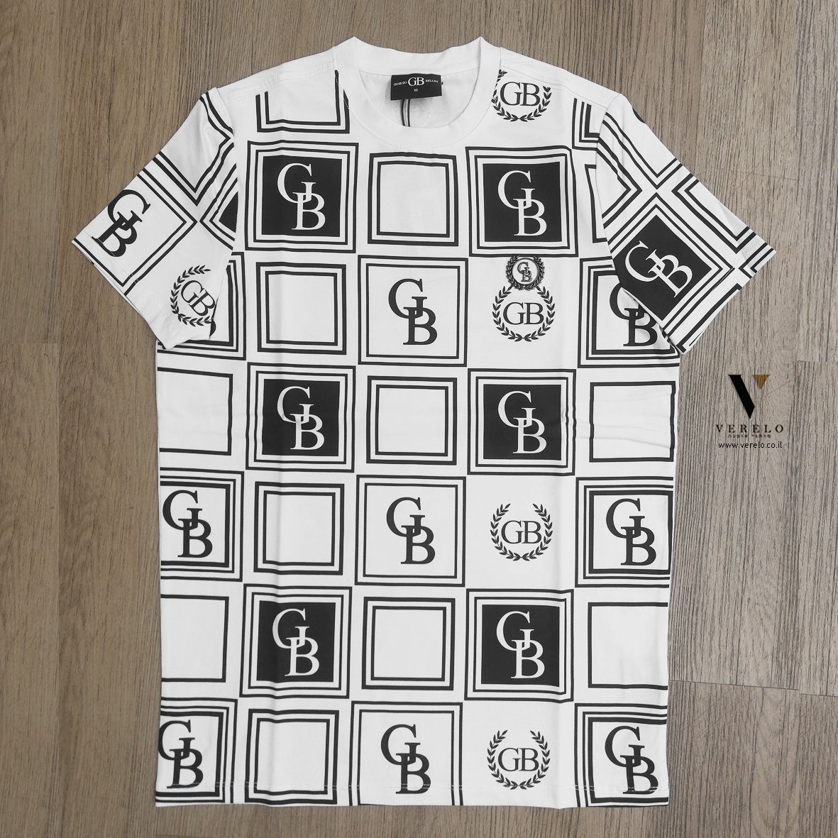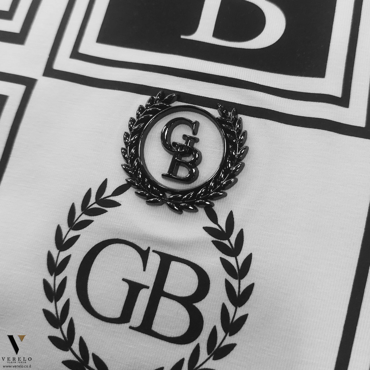 •לוגו החברה GB בקטן מפוזר על כל הטי-שירט מקדימה ובשרוולים והכל עבודת הדפס.