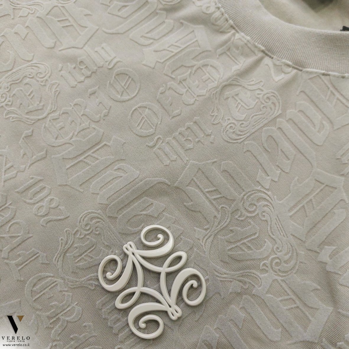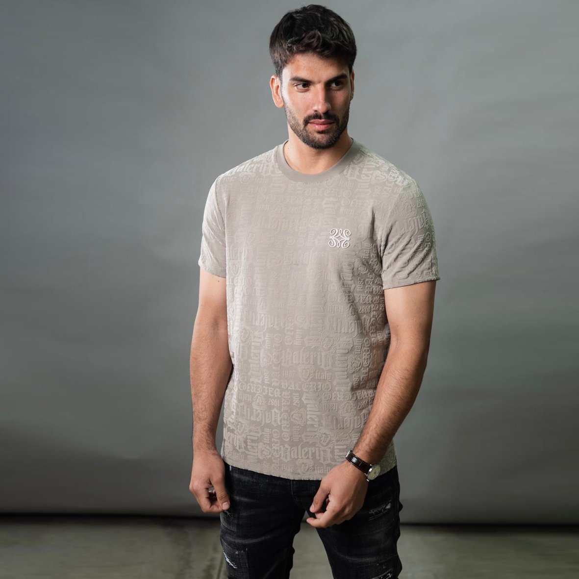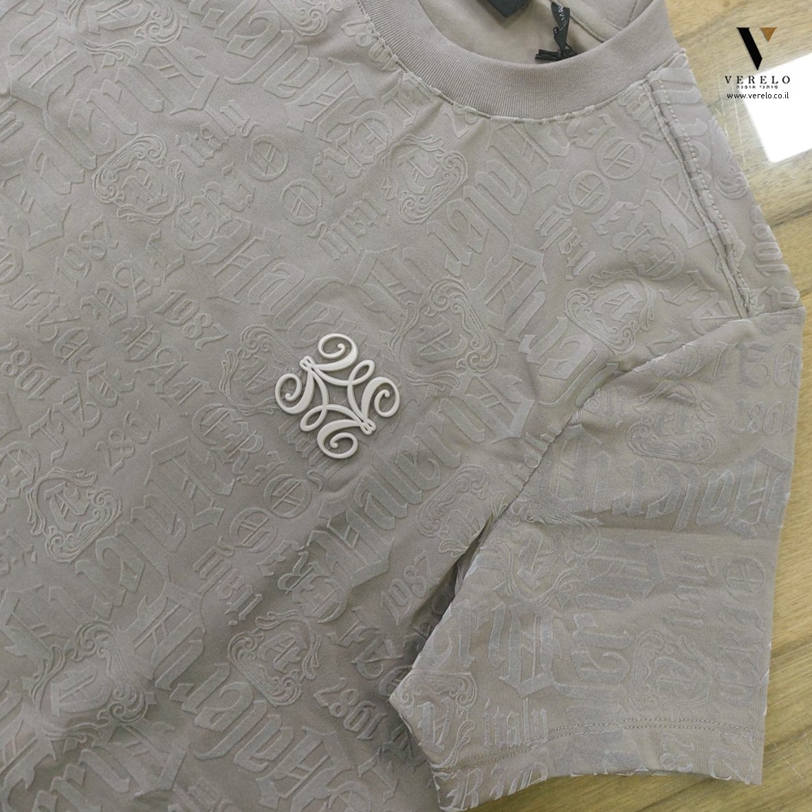 טי-שירט עם עיצוב טיפוגרפי של VALERIO עם שילוב סמל החברה בבלטה שחורה קטנה בחזית הטי.