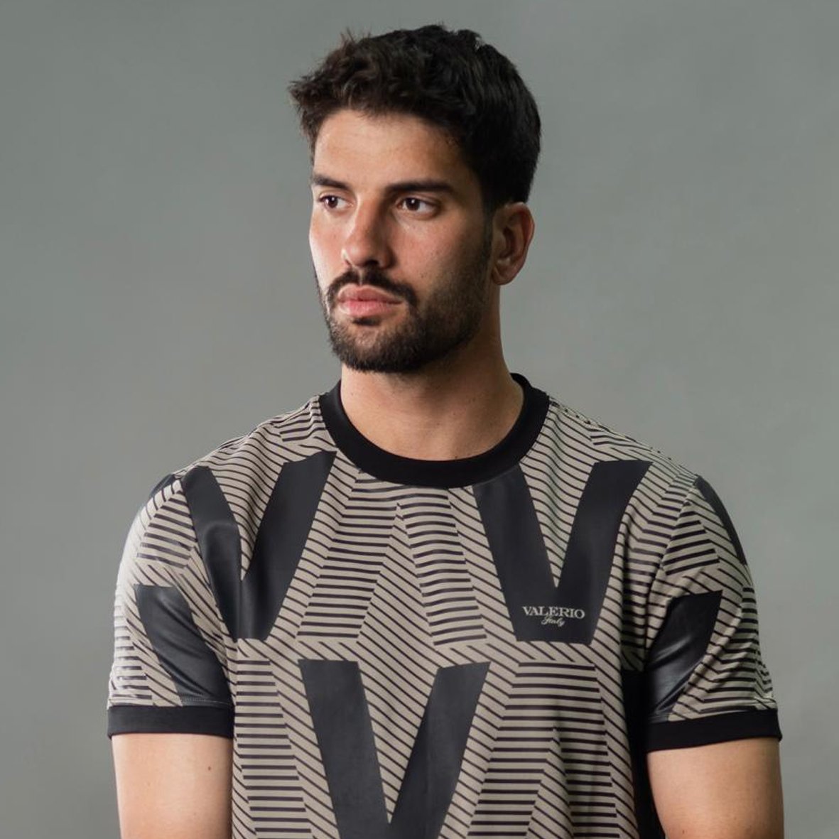• גזרת SLIM עיצוב מודרני יפה עם שילוב שם החברה VALERIO בקטן בחזית החולצה .
