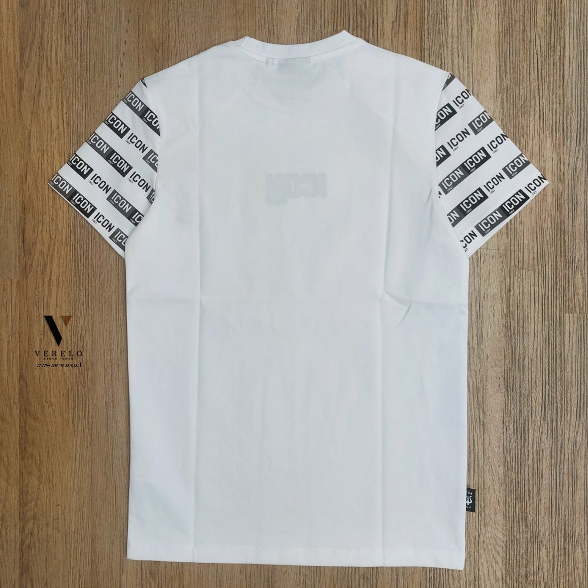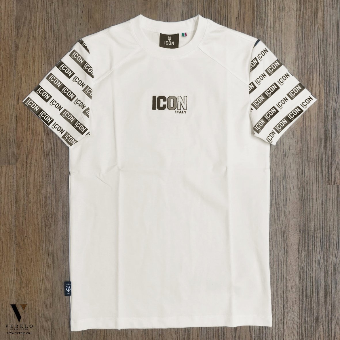 - גזרת SLIM עיצוב טיפוגרפיה יפה עם שילוב שם החברה ICON ITALY בקטן משוכפל בשרוולים של החולצה מקדימה וגם מאחורה עבודת הדפס .