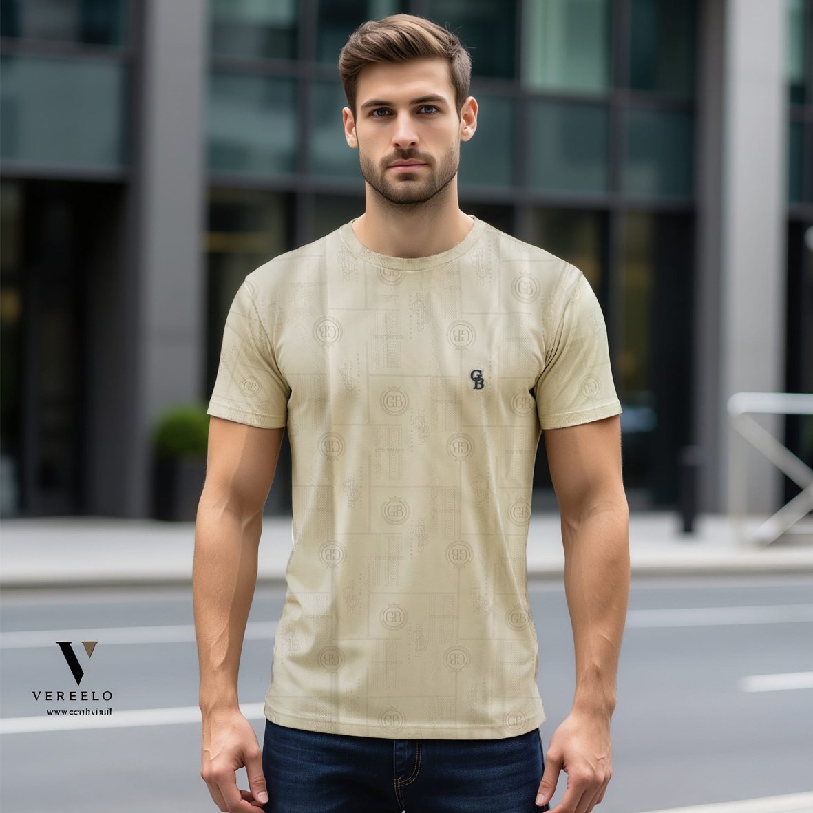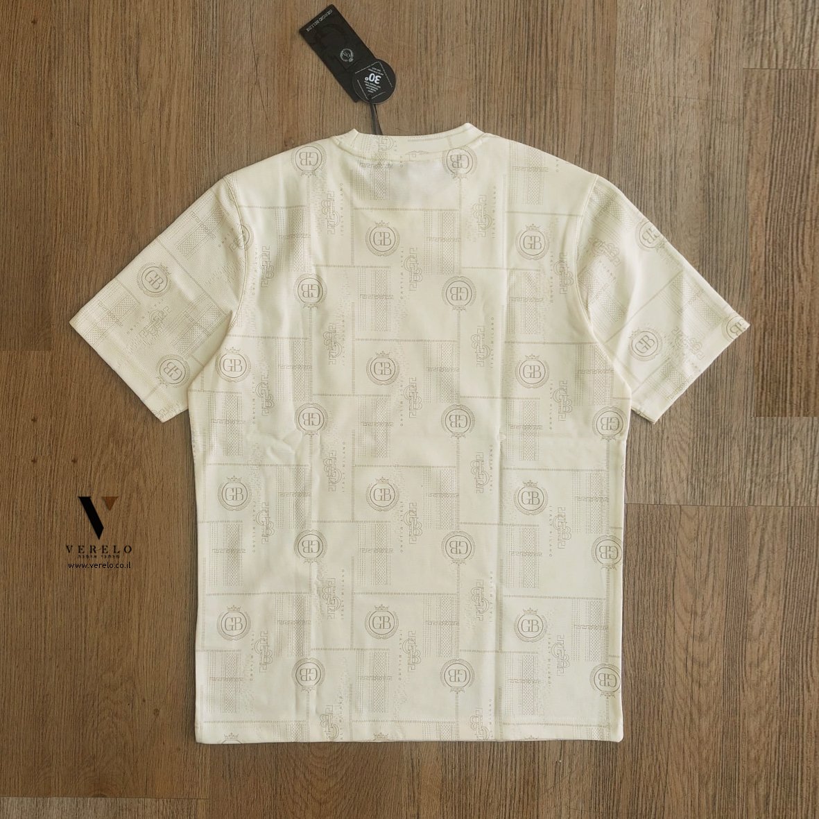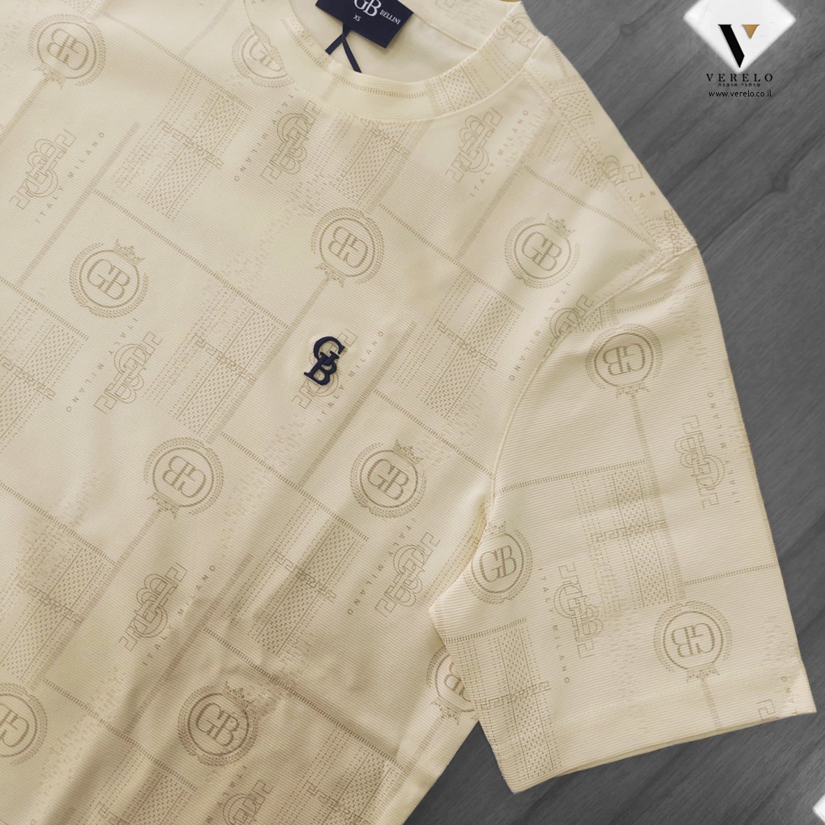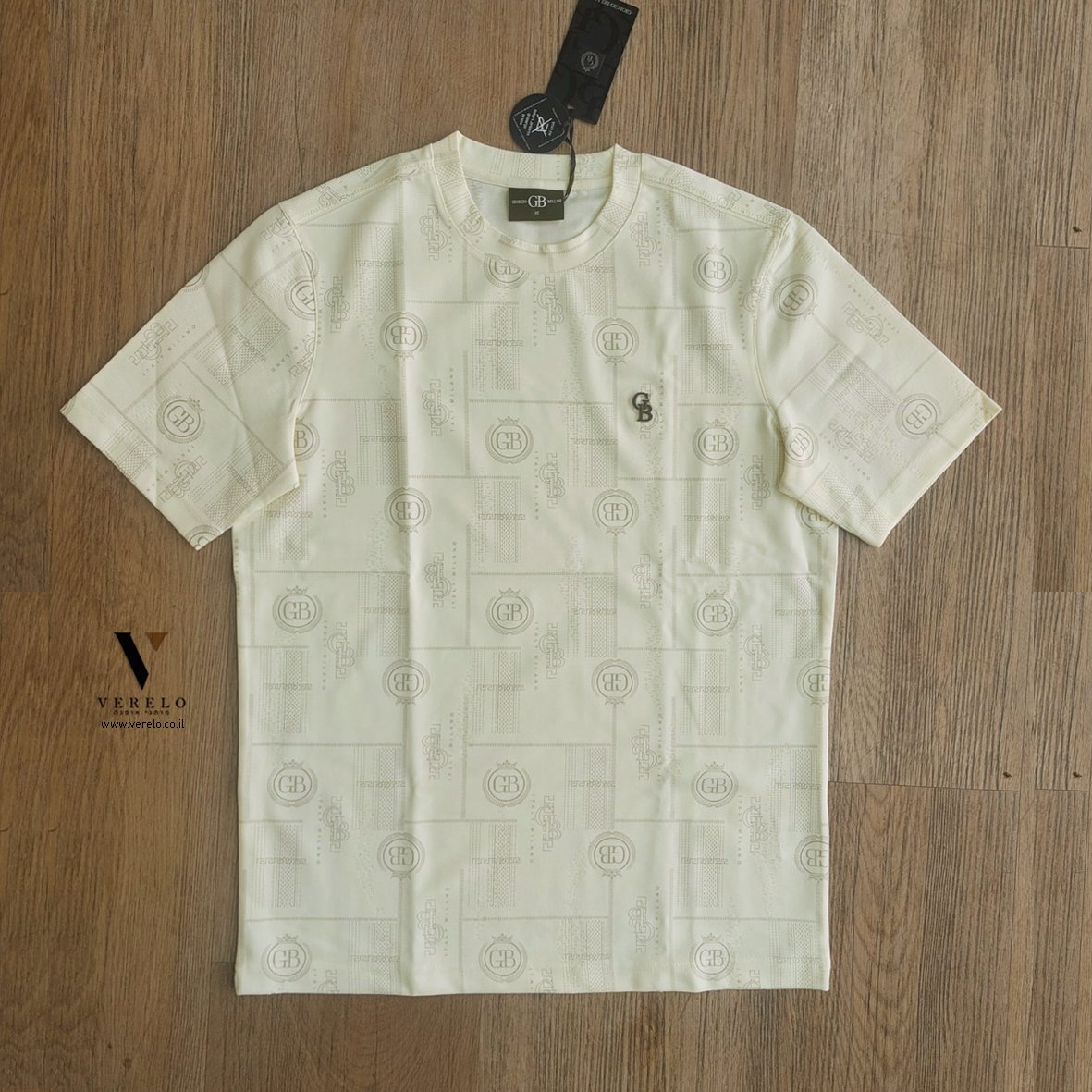 •סמל החברה GB בקטן באותיות בולטות בקטן בחזית החולצה.