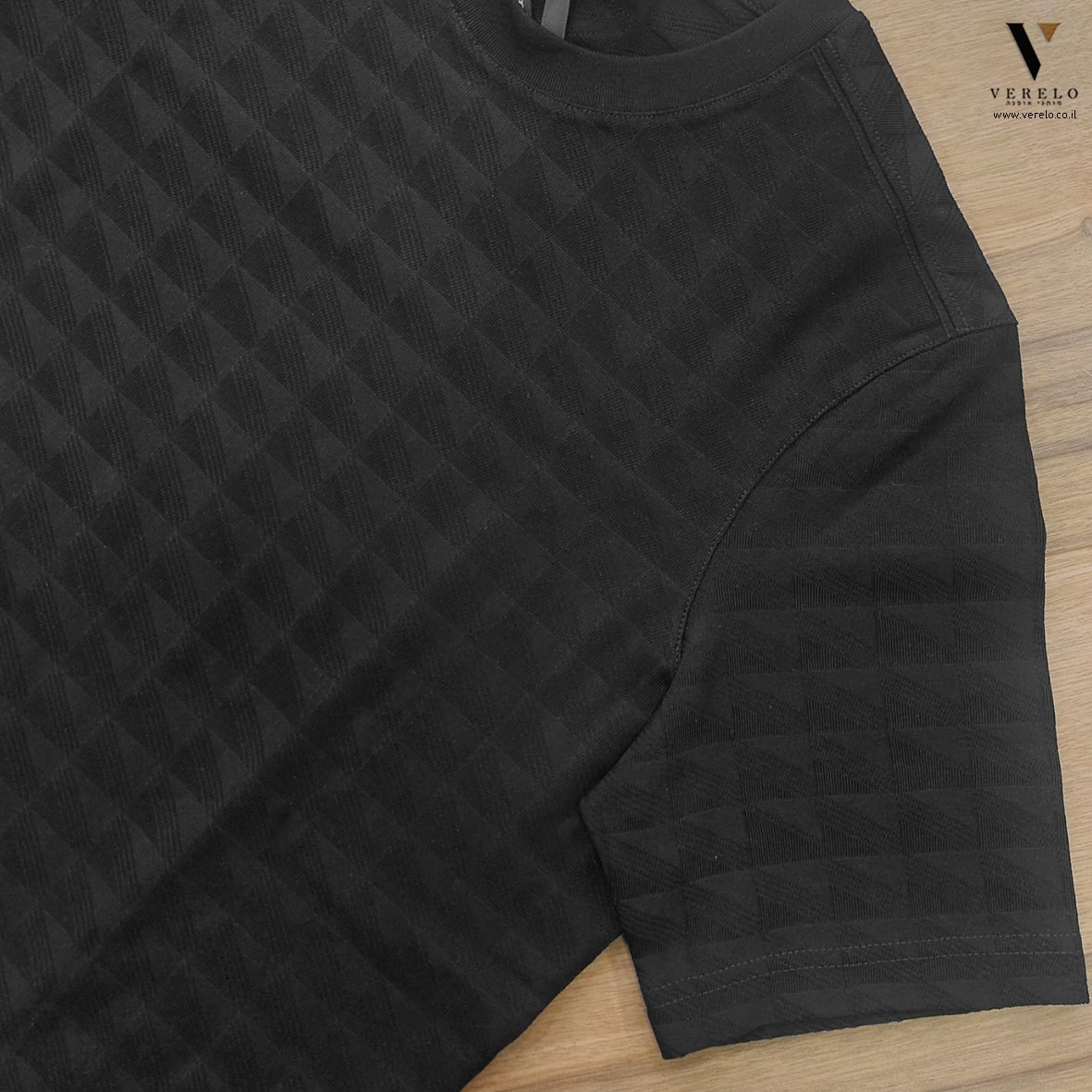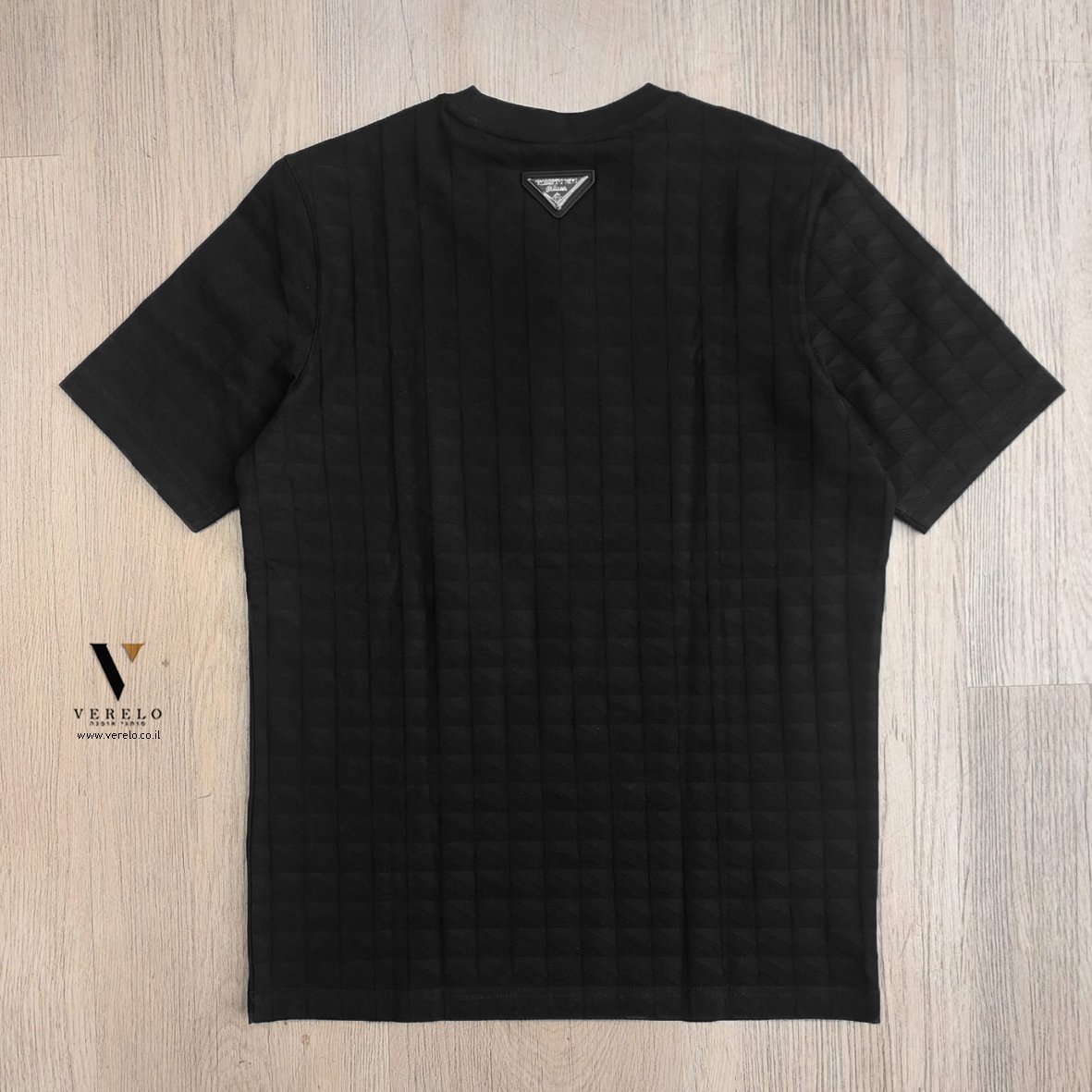 טי-שירט מבד סריג כותנה שילוב טקסטורת מרובע על כל הטי מקדימה וגם בגב עבודת ריקמה.