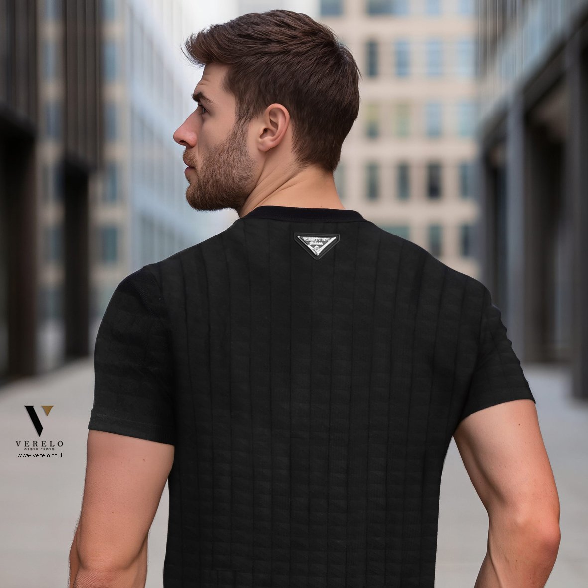 טי-שירט מבד סריג שחור מעוצב של ROBERTO VINO עם שילוב סמל החברה RV חרוט על בלטה קטנה בגב החולצה.