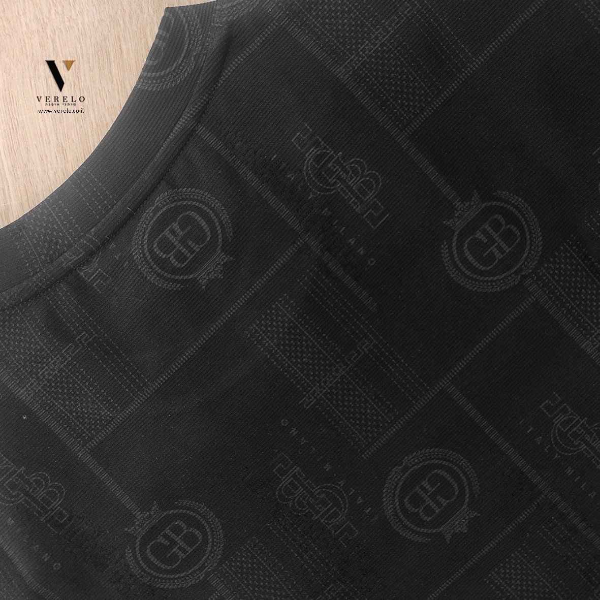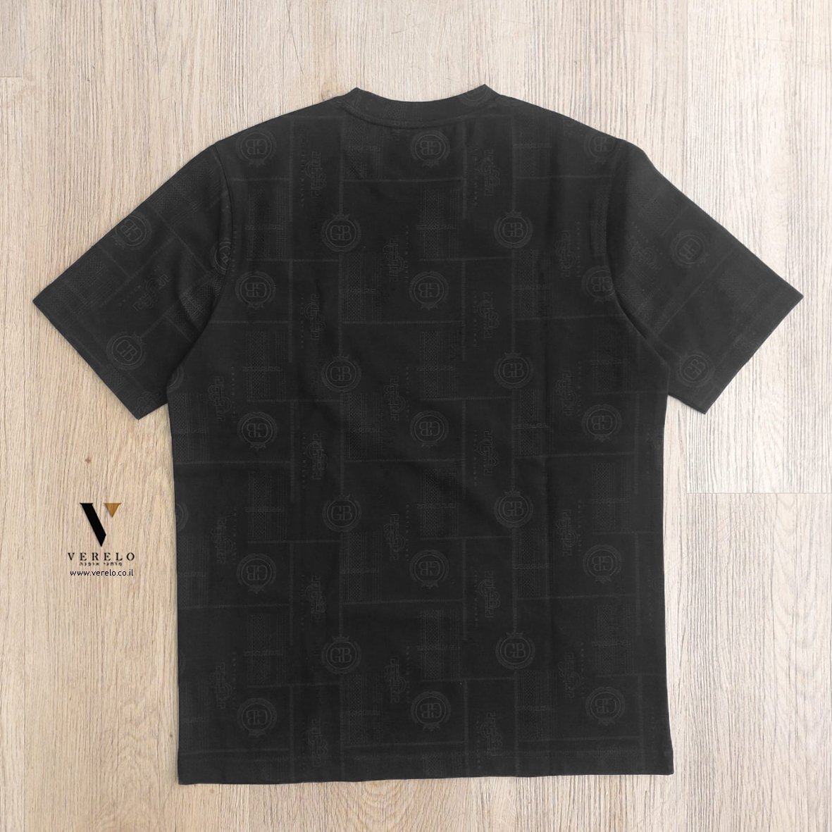 •לוגו החברה GB בתוך כתר עם עיצוב יפה ומפוזר על כל הטי-שירט מקדימה ובגב וגם על השרוולים והכל עבודת הדפס.