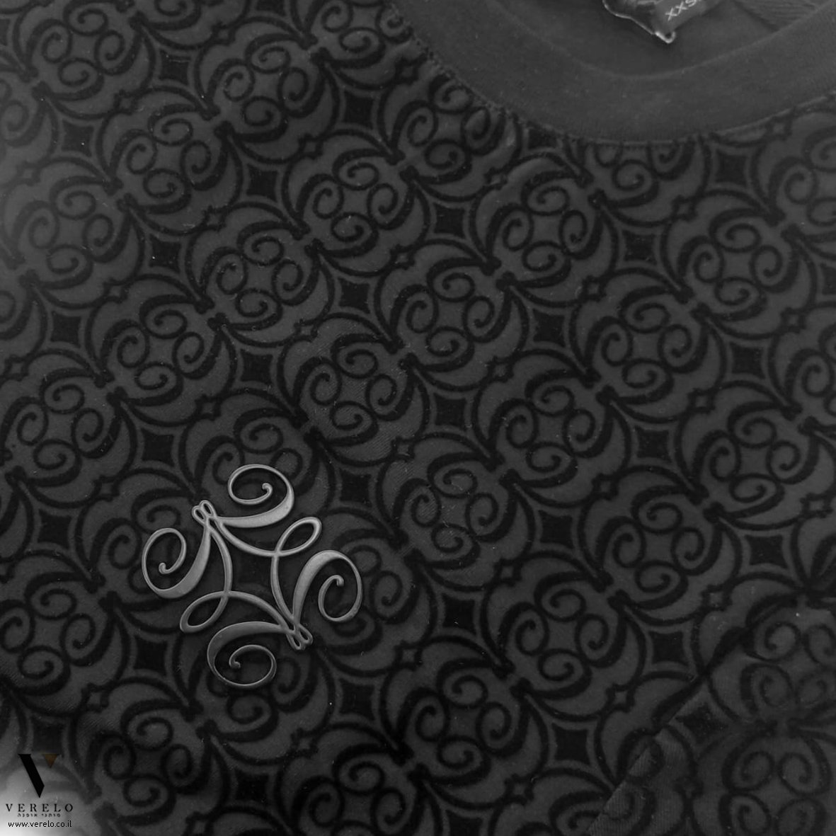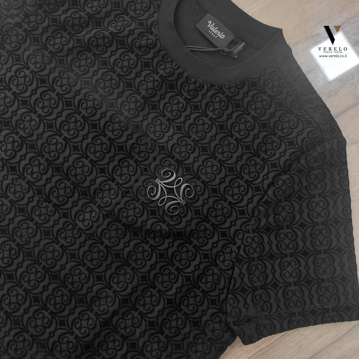 טי-שירט עם עיצוב טיפוגרפי של VALERIO עם שילוב סמל החברה בבלטה שחורה קטנה בחזית הטי.