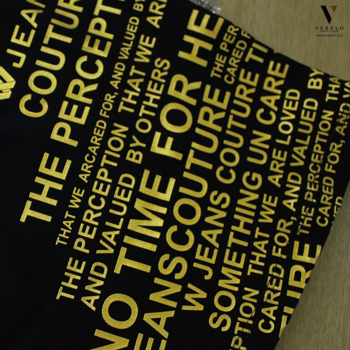 •שם החברה W JEANS באותיות מודפסות בצבע זהב בצד בתחתית של החולצה עיצוב טיפוגרפיה יפה.