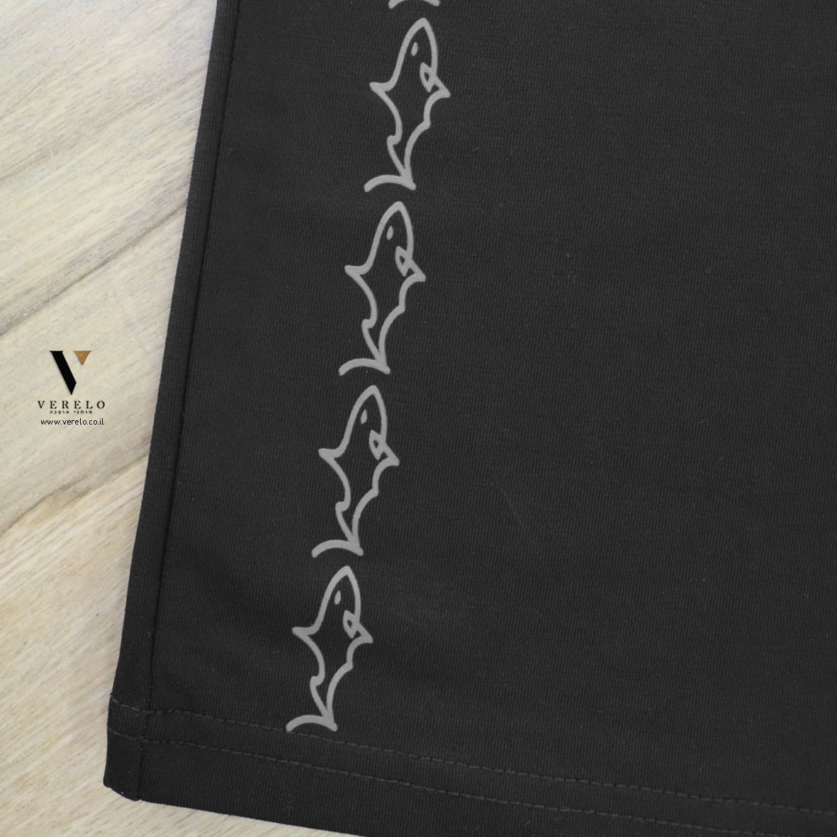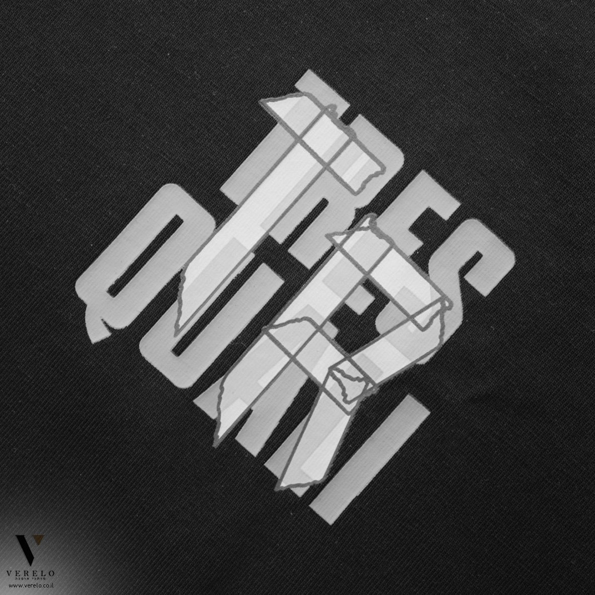 •טי שירט עם עיצוב טיפוגרפי יפה בחזית החולצה בקטן וגם בצד החולצה שילוב סמלי הכריש בקטן עבודת הדפס.
