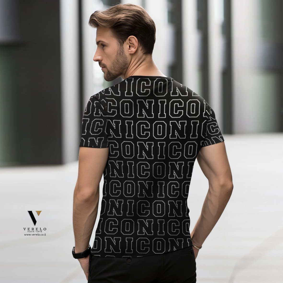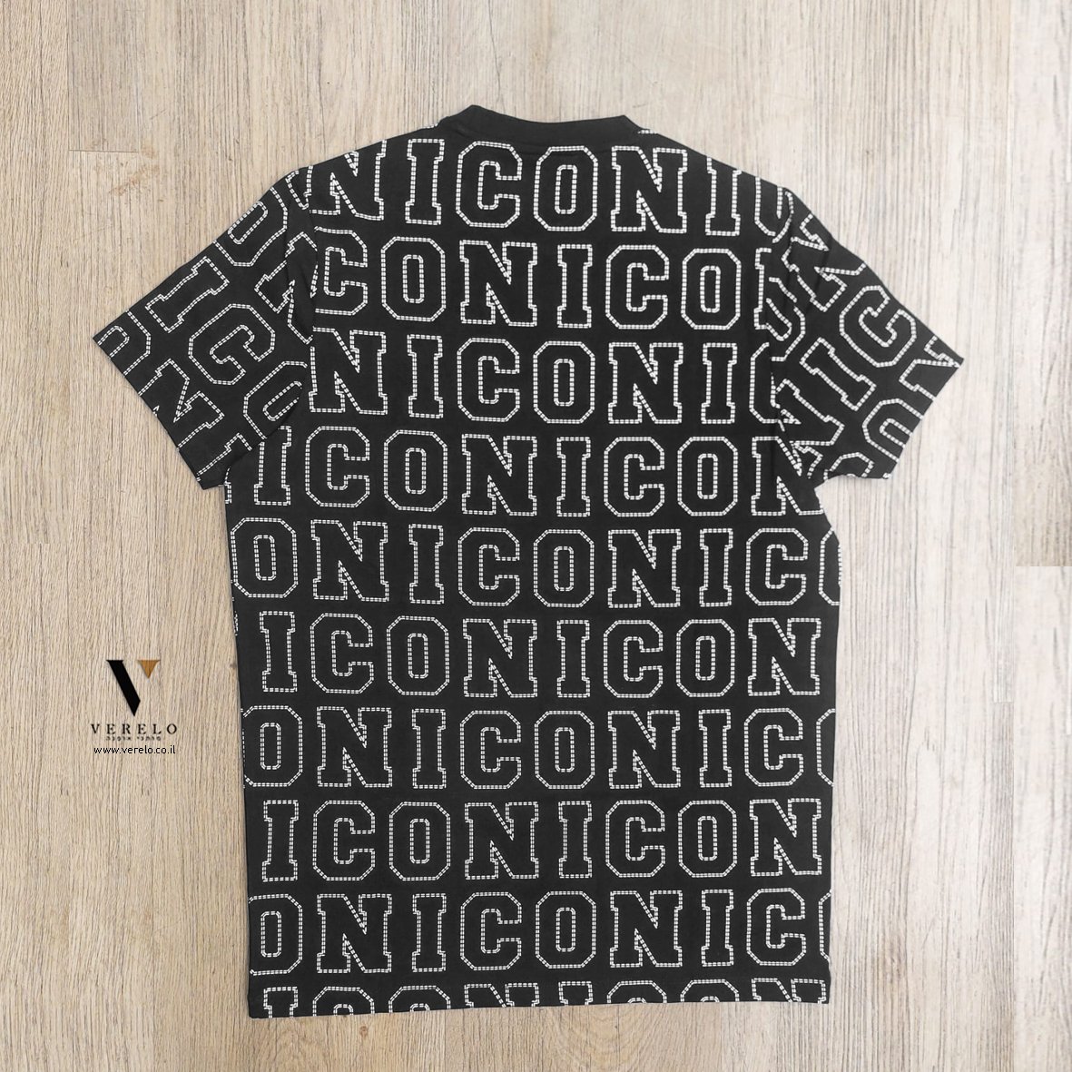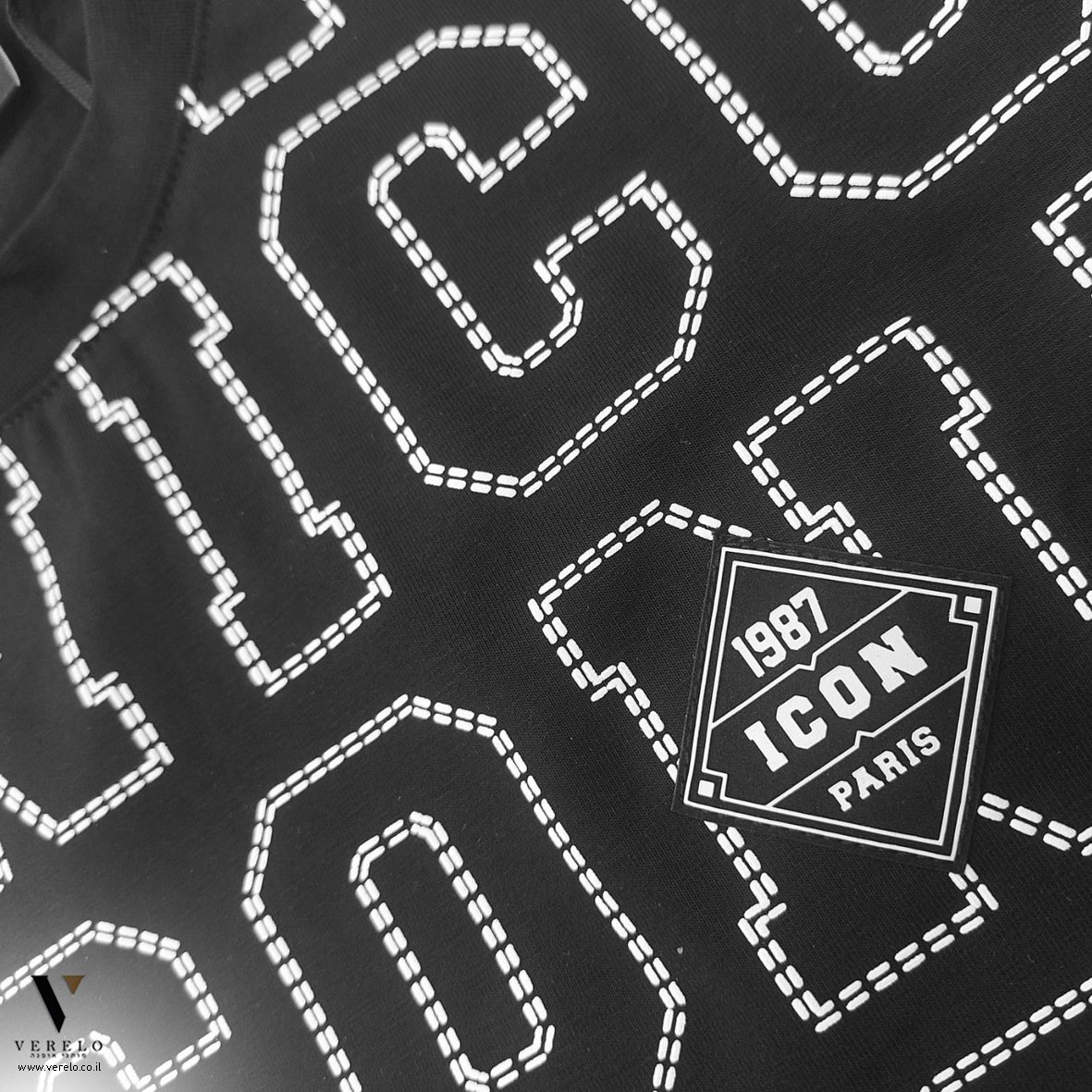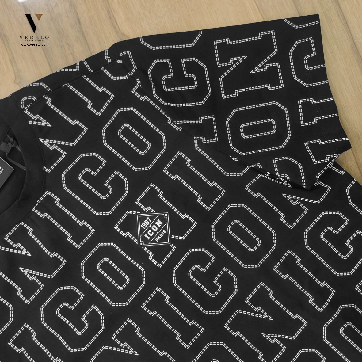 •סמל החברה ICON PARIS בעיצוב טיפוגרפי יפה בקטן בחזית של החולצה בצע לבן.