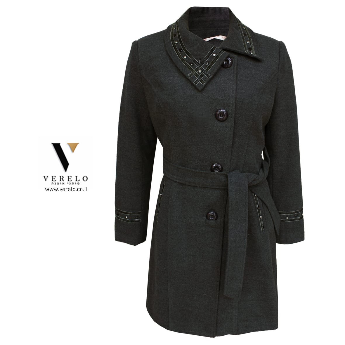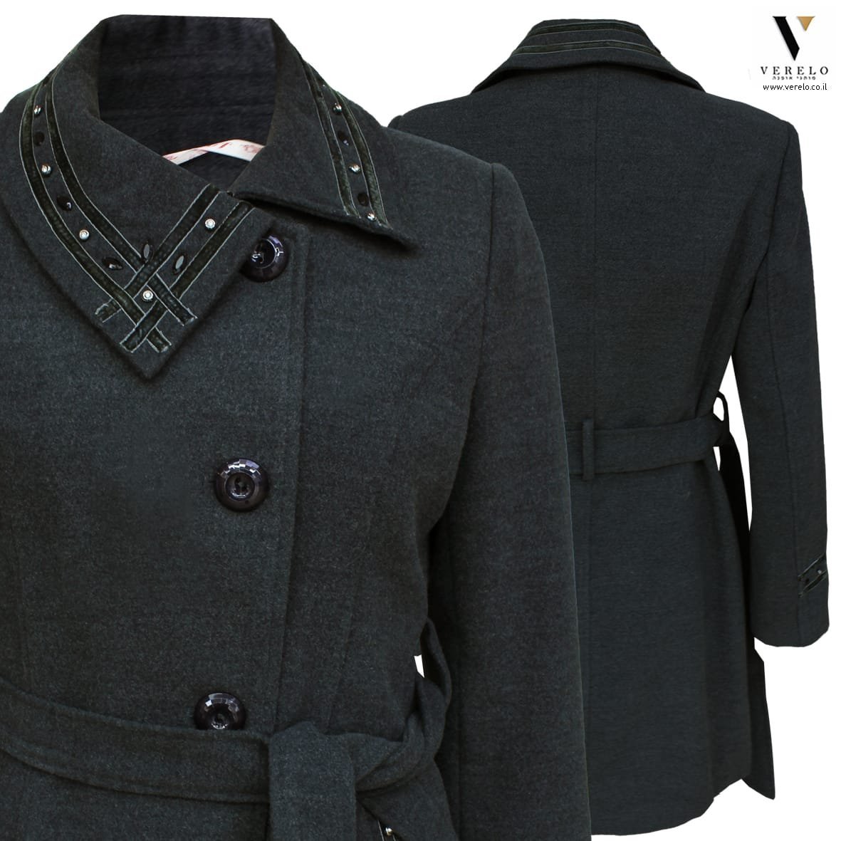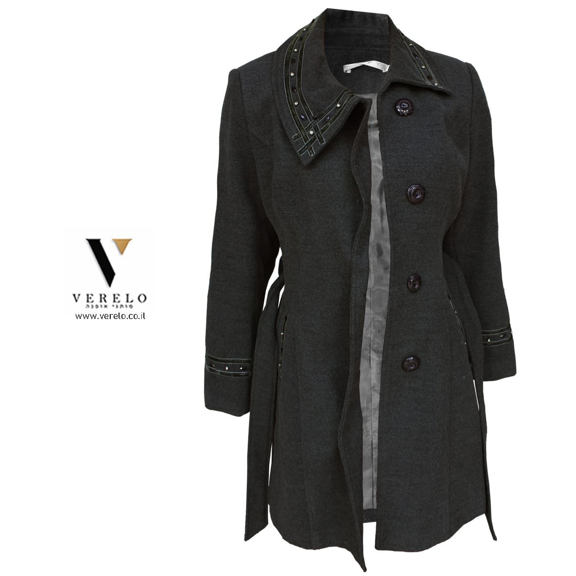 חגורה תואמת, כפתורים גדולים וכיסים בצדדים עם שילוב אבנים.