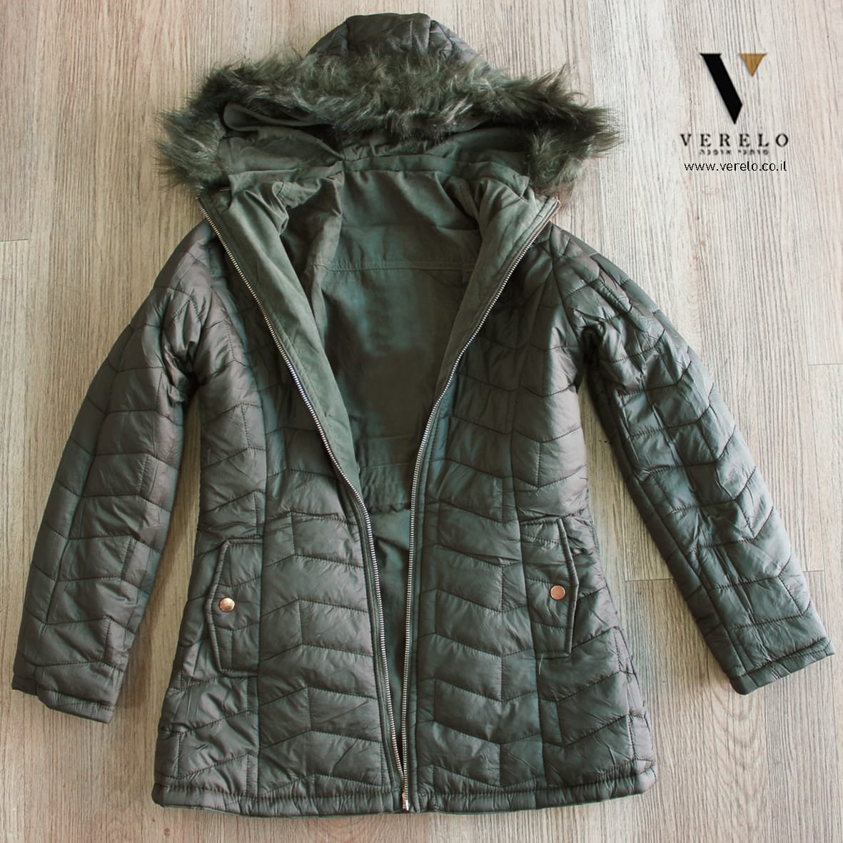 מעיל רך משקל וקל עם כובע עם פרווה סינתטית.