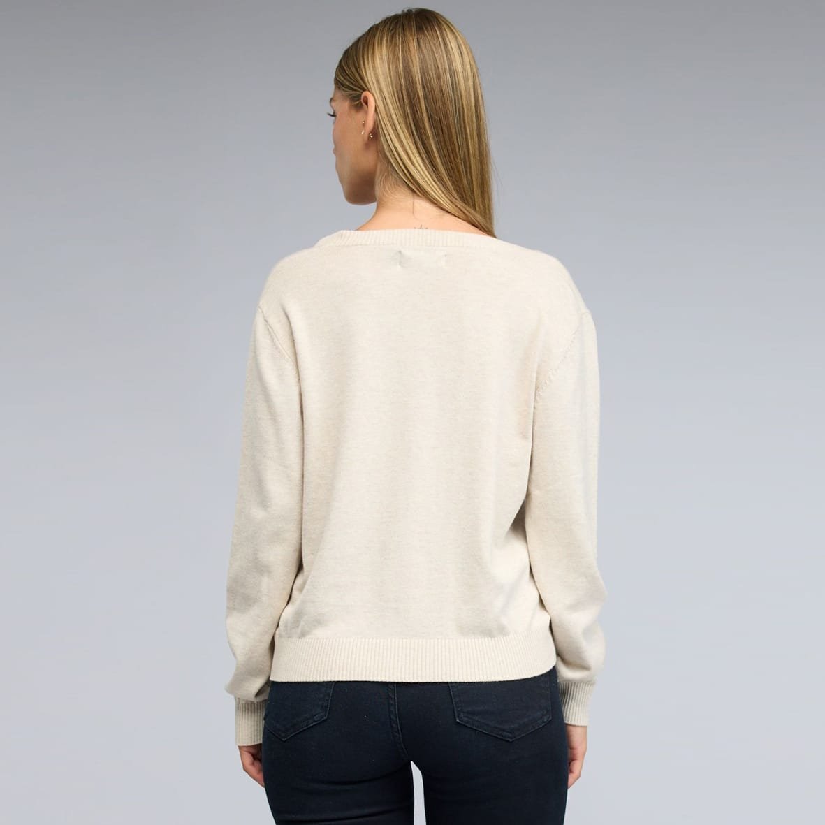 סריג גזרה צמודה עם שרוולים ארוכים וצווארון וי עמוק.