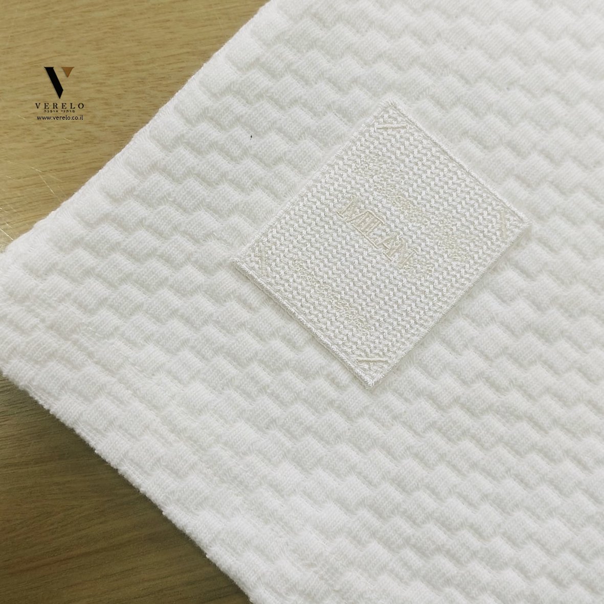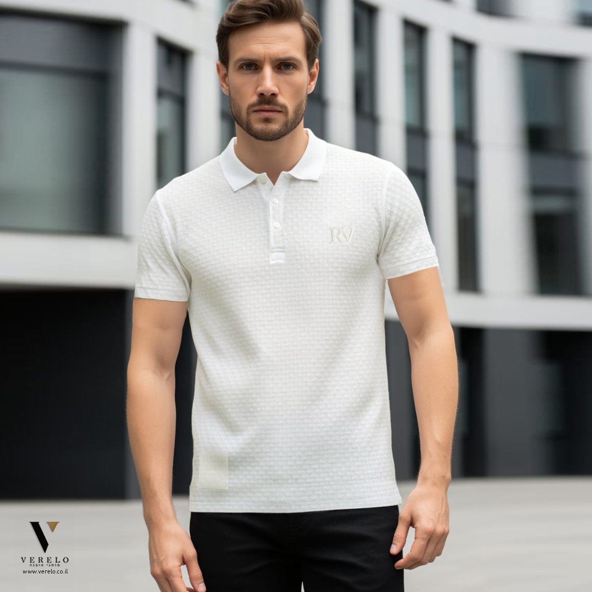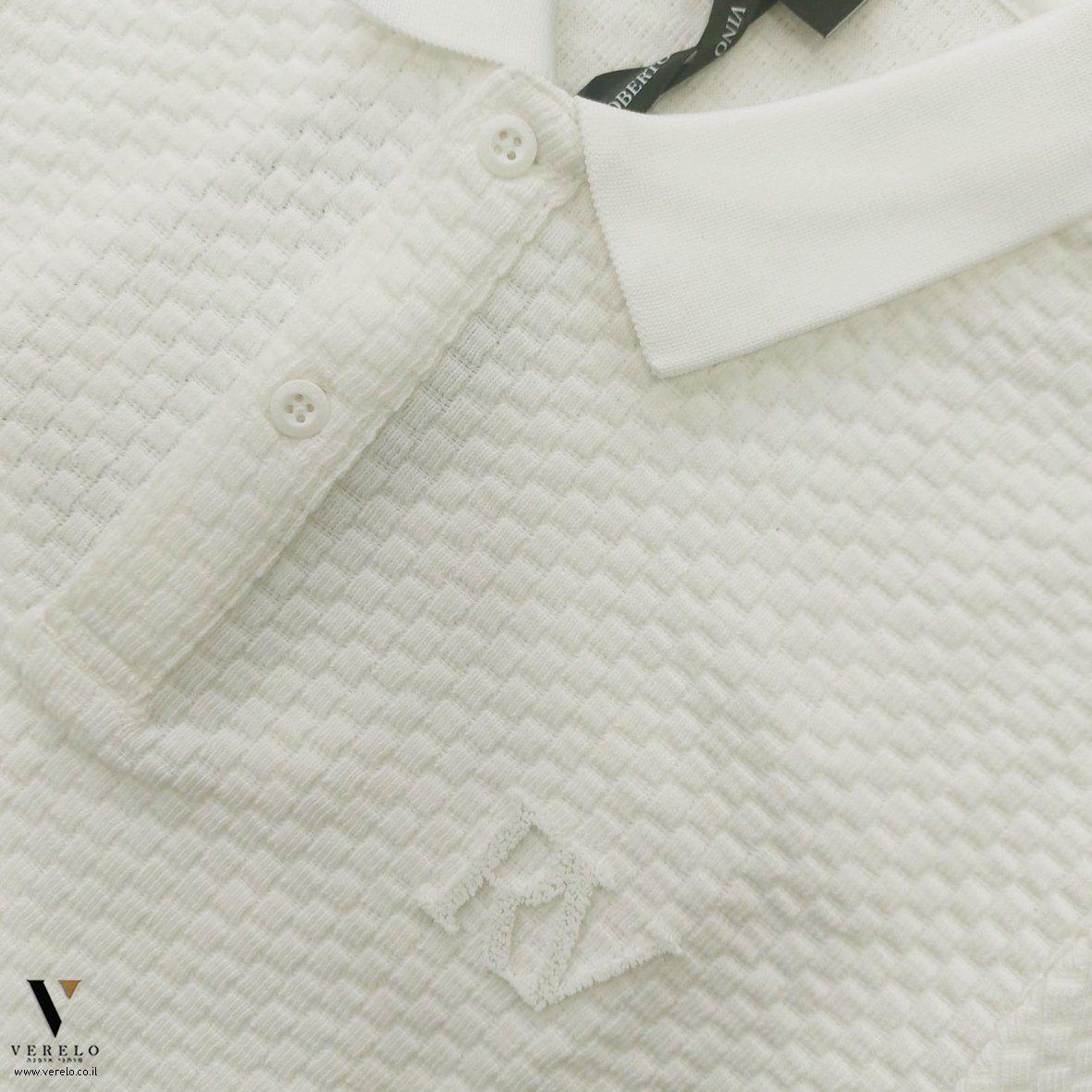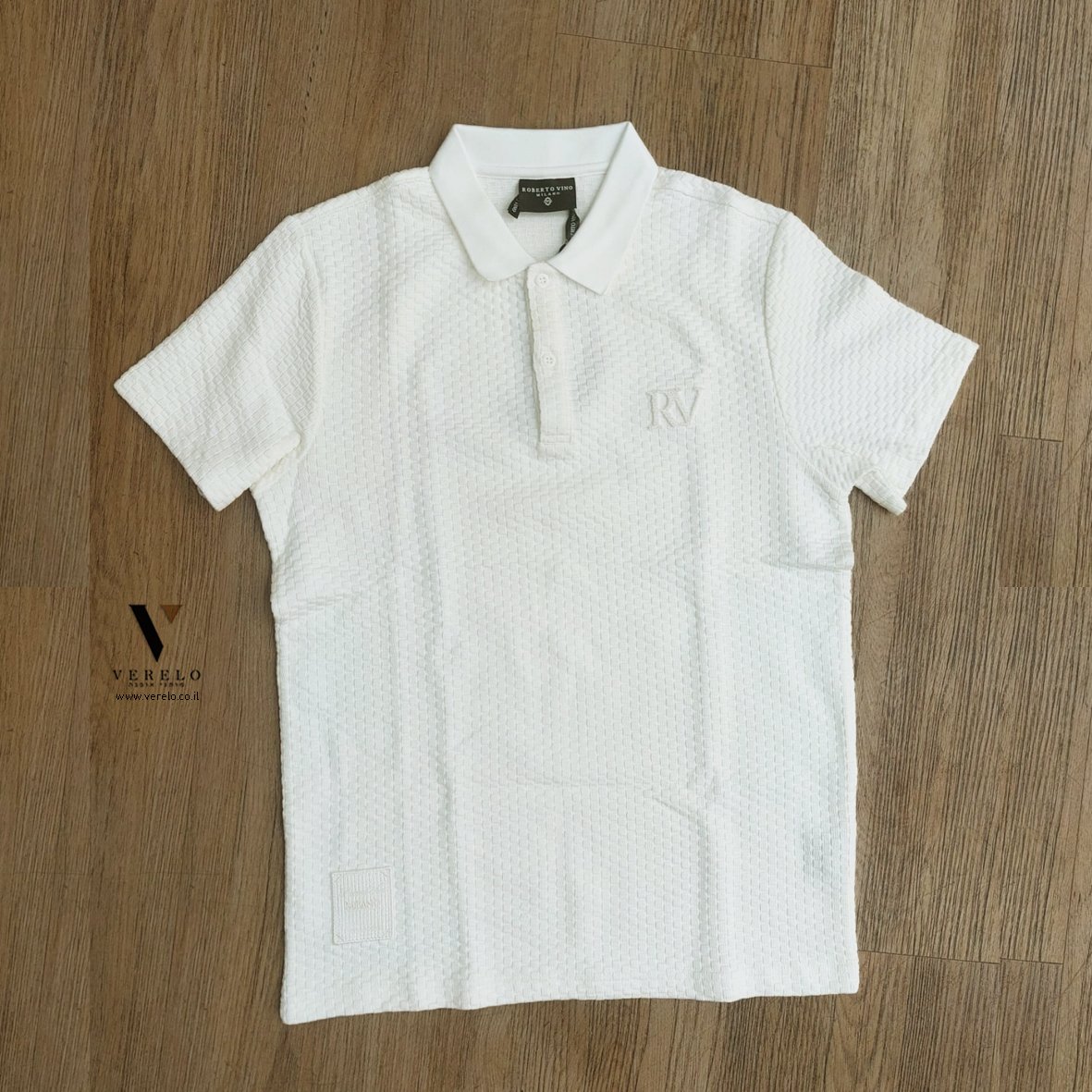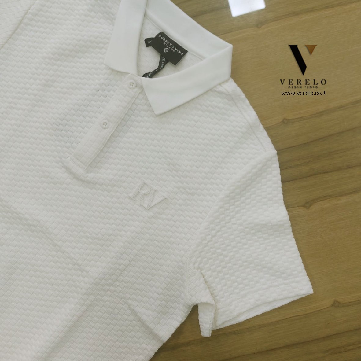 פולו קצר מבד סריג לבן מעוצב של ROBERTO VINO עם שילוב סמל החברה RV חרוט על בקטנה בחזית החולצה.