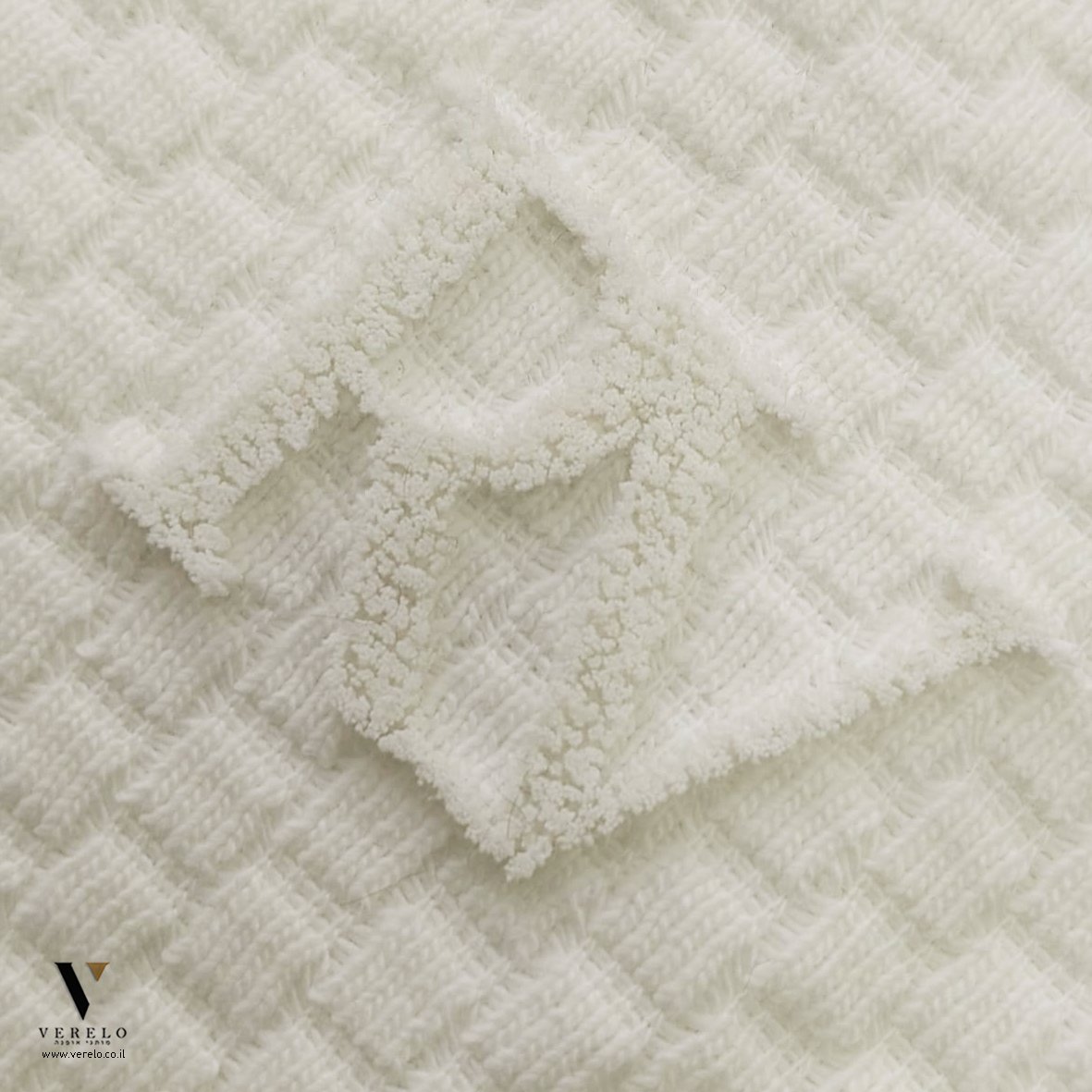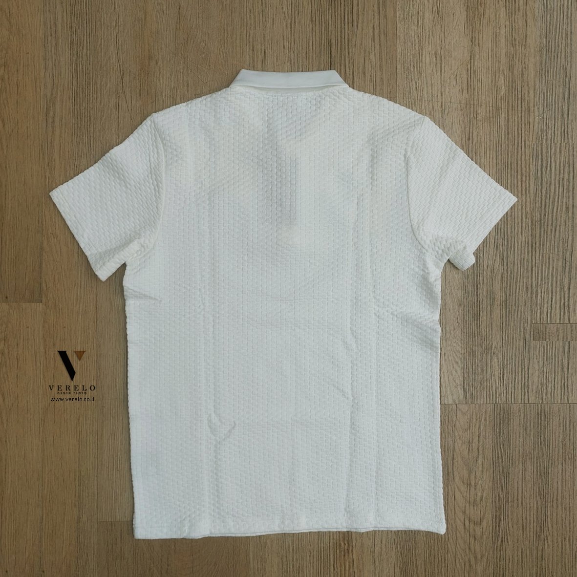 פולו קצר מבד סריג כותנה עם טקסטורת מרובעים על כל הטי מקדימה וגם בגב עבודת ריקמה.