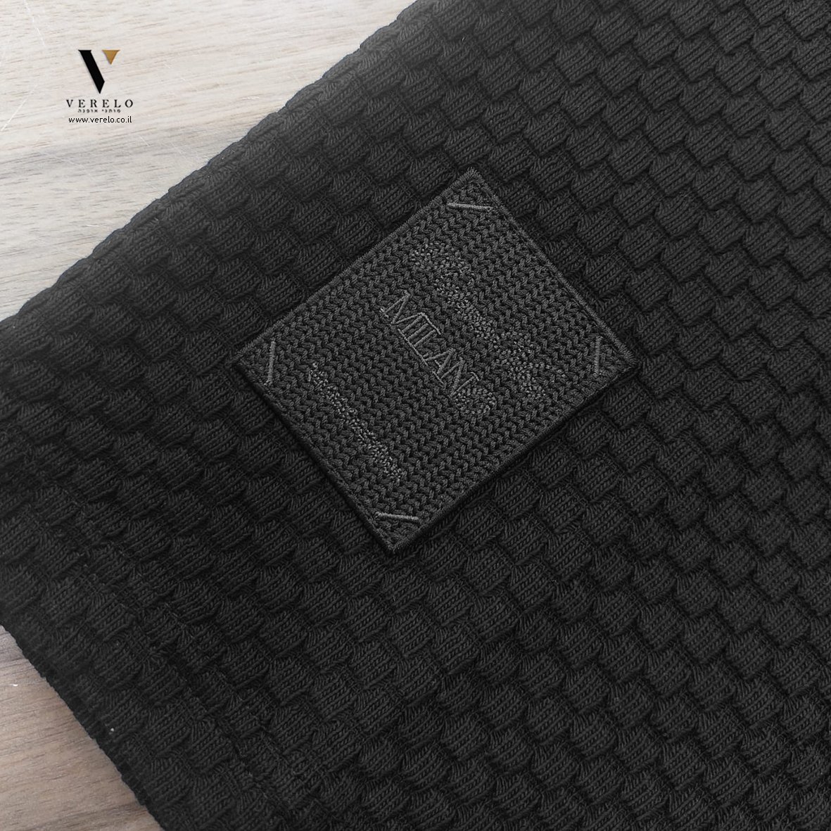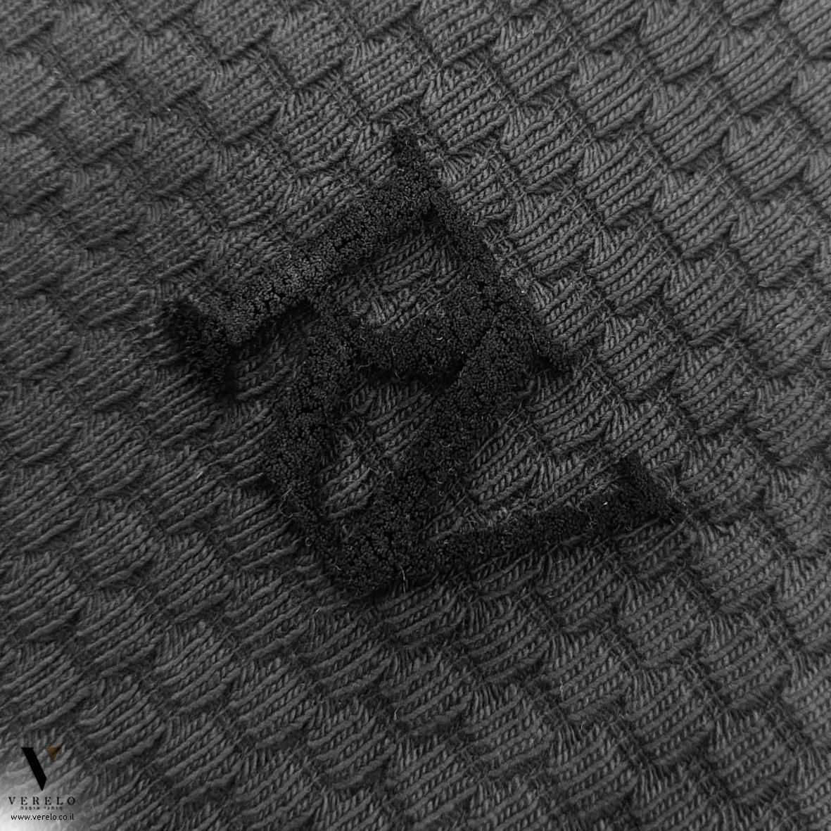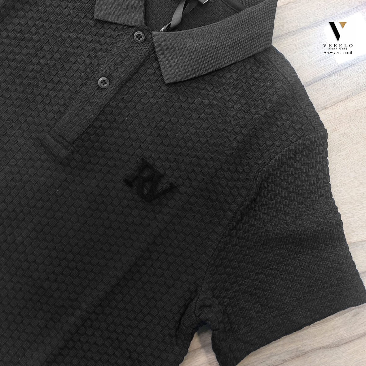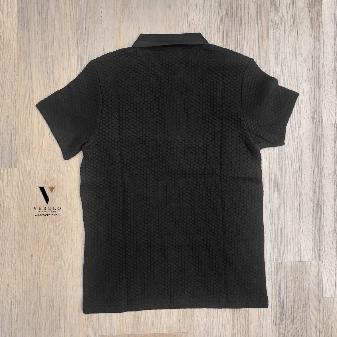 פולו קצר מבד סריג כותנה עם טקסטורת מרובעים על כל הטי מקדימה וגם בגב עבודת ריקמה.