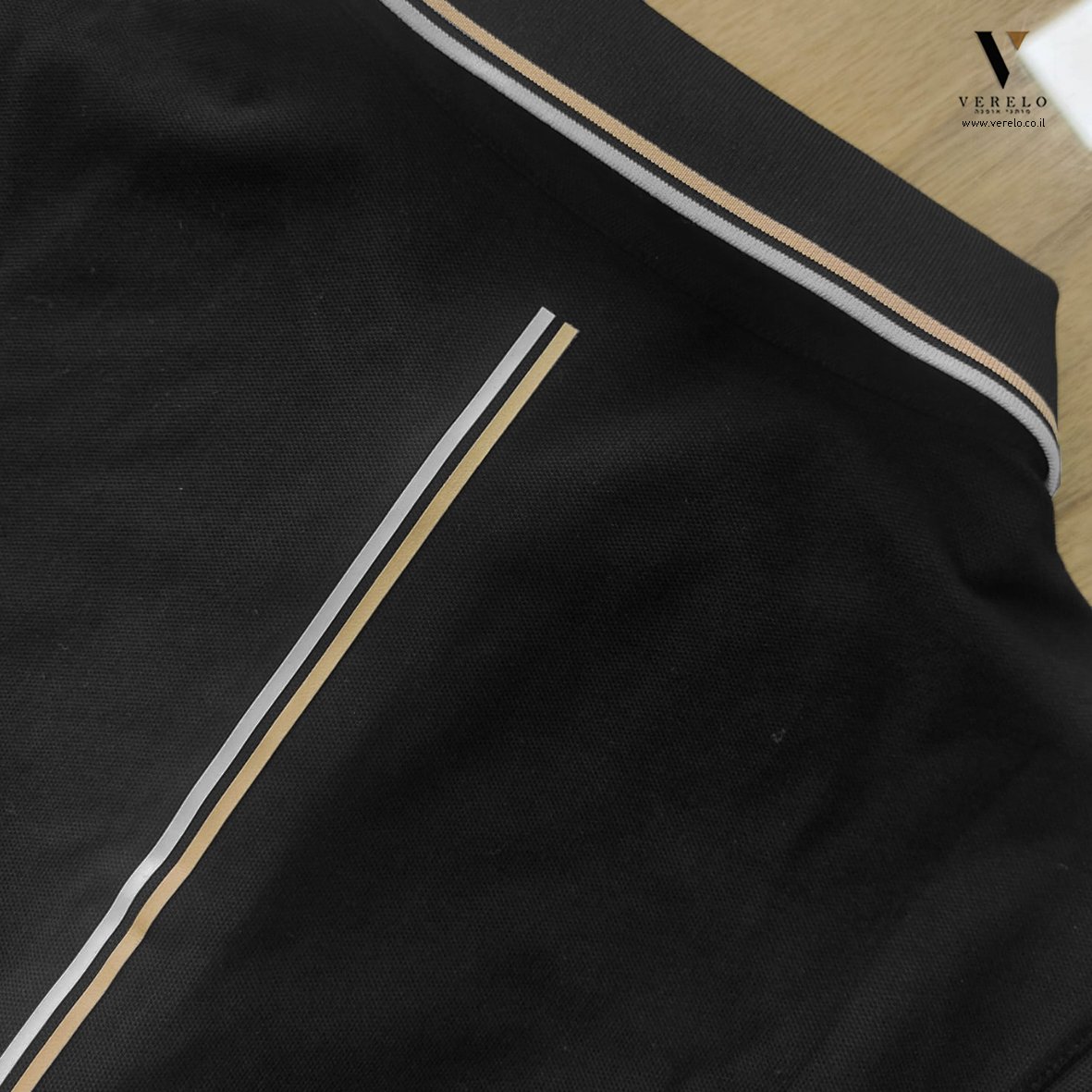 • פולו קצר מבד כותנה עם שילוב בסים על הצווארון וגם בגדול באמצע הגב של