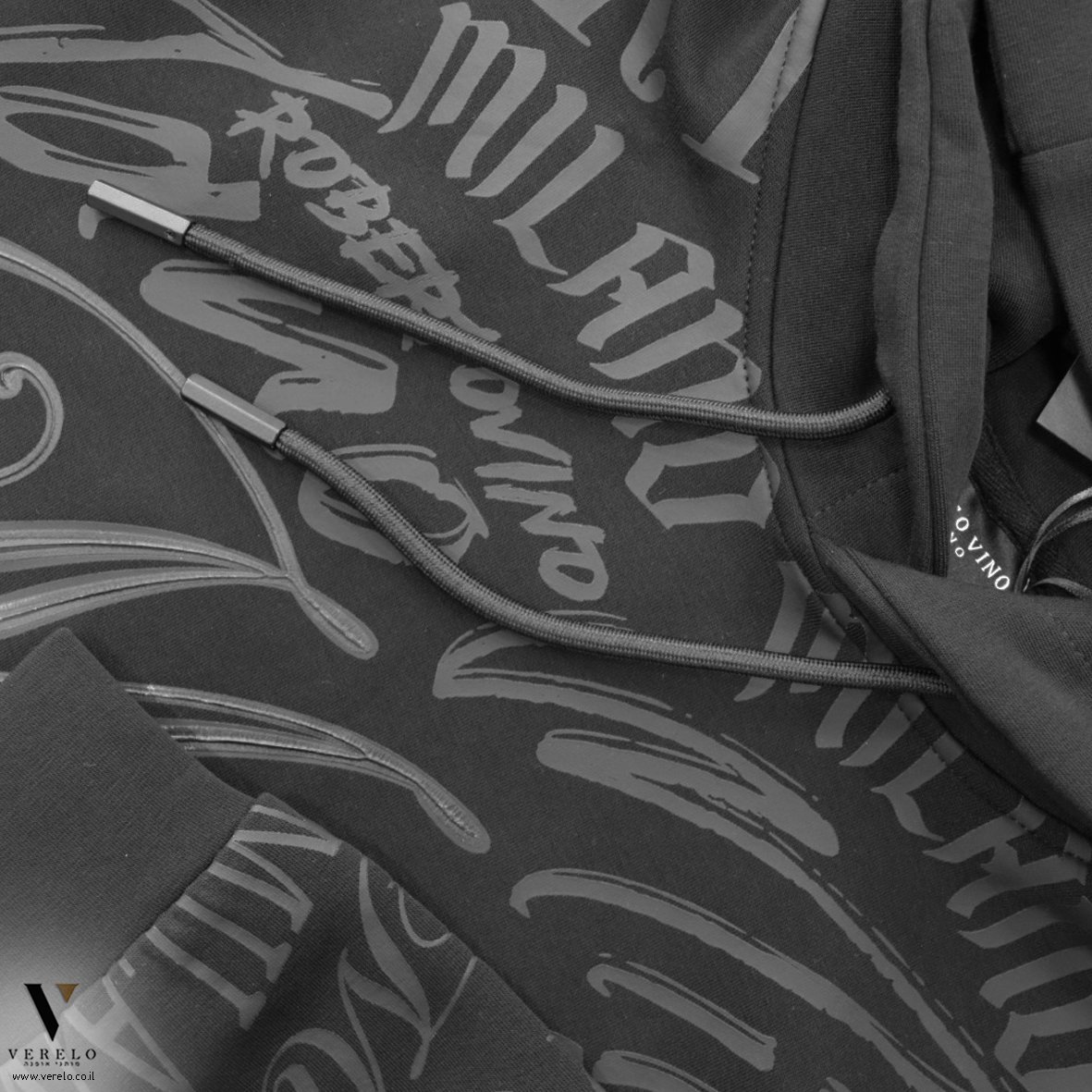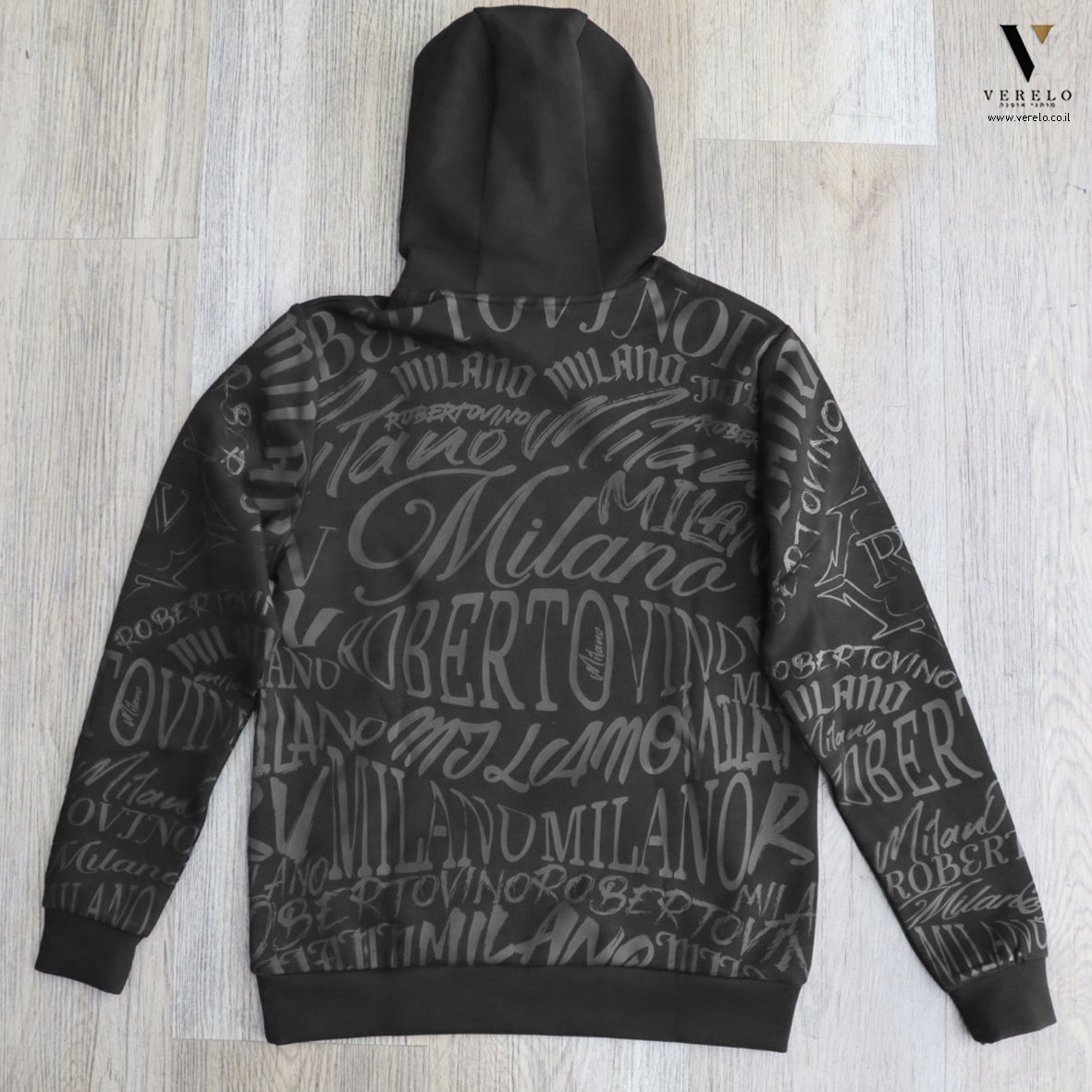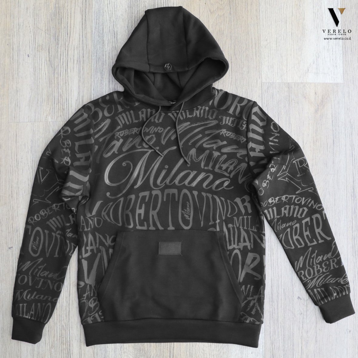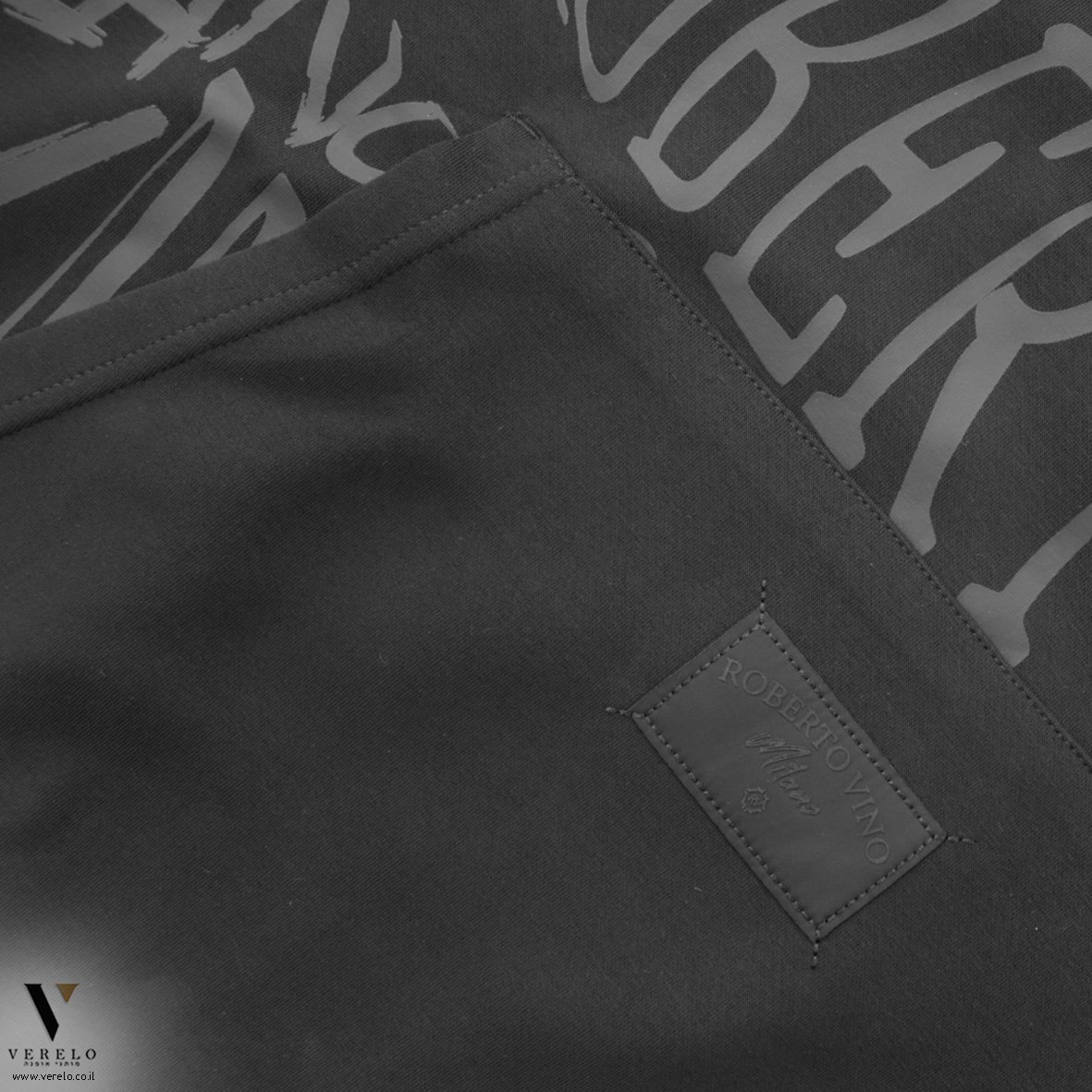 הקפוצ’ון עם עיצוב טיפוגרפי מודפס עם שם החברה ROBERTO VINO מפוזר על כל החולצה בחזית החולצה וגם בגב.