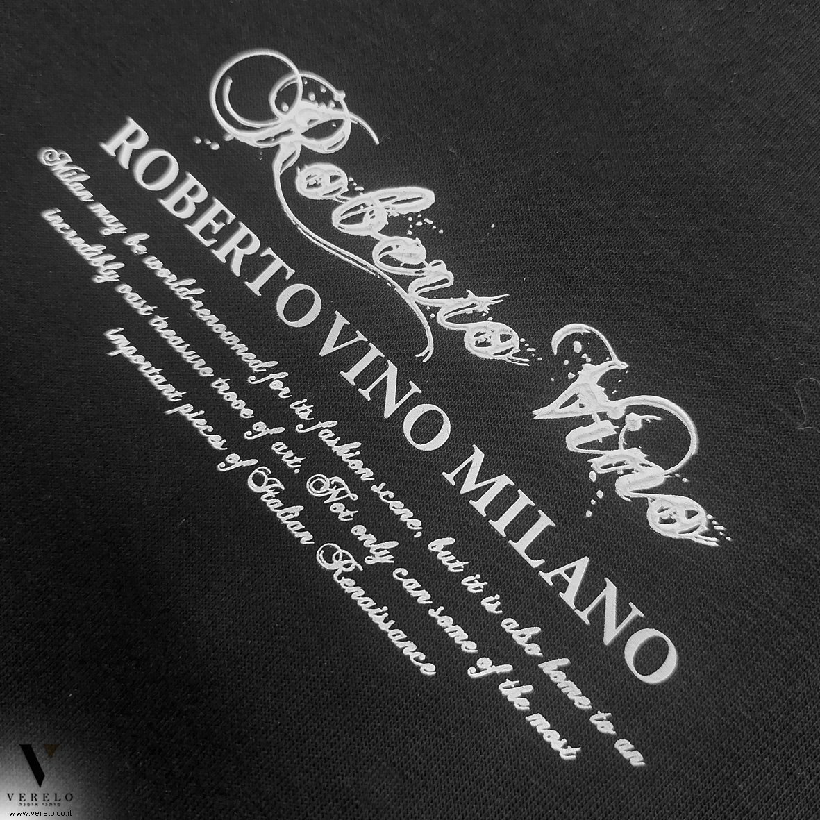 הקפוצ’ון עם עיצוב יפה עם שילוב של חברת ROBERTO VINO בקטן בחזית החולצה ועיצוב מודפס גדול בגב החולצה עם שילוב עיצוב יפה בשרוולים.